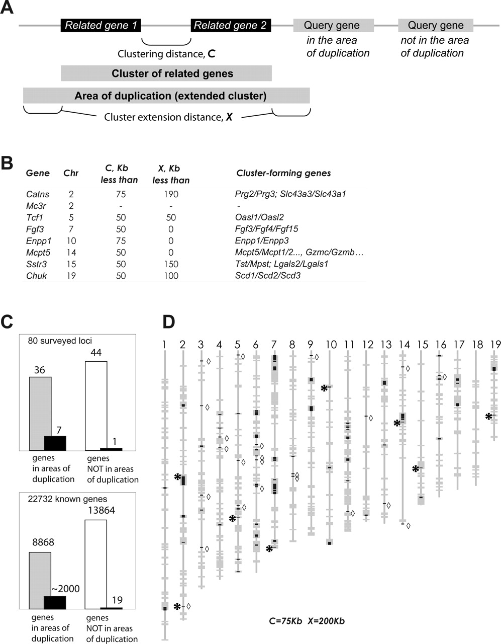 Asynchronously replicated genes are associated with regions of tandem gene duplication. (A) Defining the areas of gene duplication. Two or more genes are considered clustered if they encode related proteins (relatedness of proteins determined by BLASTP analysis of the complete nonredundant set of mouse protein-coding genes; see details in the text) and are no more than C Kb apart in the genome. To define an area of gene duplication, such a cluster is extended by X Kb in either direction. A gene is counted as belonging to an area of duplication if it overlaps in whole or partially with such an area; in the hypothetical depicted example, three genes fall within an area of gene duplication, and one does not. (B) Determining the values of parameters C and X for the whole-genome analysis. Minimal values of these parameters for each of the novel asynchronously replicated genes are shown. When the clustering parameters are set at C = 75 Kb, X = 200 Kb, then all these loci, with the exception of Mc3r, fall within the gene duplication areas. (C) Summary of the whole-genome clustering analysis. (Top) Of the 80 loci assessed in this study, 36 were in the areas of gene duplication (gray bar), and the rest were outside of such areas (white bar). Of the genes we identified as asynchronously replicated (black bars), seven were in the areas of duplication. (Bottom) 39% of mouse genes (8868 of 22,732 sequences analyzed) are in the areas of gene duplication (gray bar), with clustering parameters set at C = 75 Kb and X = 200 Kb uniformly applied to the locations of genes on the mouse genome assembly (NCBI build 33). The rest of the genes were not in such areas (white bar). Note that of known and presumed genes with asynchronous replication or random monoallelic expression (black bars) a vast majority are in the areas of gene duplication. (D) Distribution of the areas of gene duplication on the mouse genome. Locations of these areas were plotted on the mouse genome assembly (gray bars; acrosomes at top). A complete set of coordinates is in Supplemental Table S2. The duplicated areas largely overlap with the known or presumed loci with asynchronous replication (black tick marks): chemosensory receptor genes and pseudogenes, and known asynchronously replicated, monoallelically expressed genes from the immune system, as well as loci identified in this study as asynchronously replicated (asterisk to the left of the locus). Of ∼2000 known or presumed asynchronously replicated loci in the genome, we found only 19 that are apparent exceptions to this rule (diamond marks to the right of the locus).