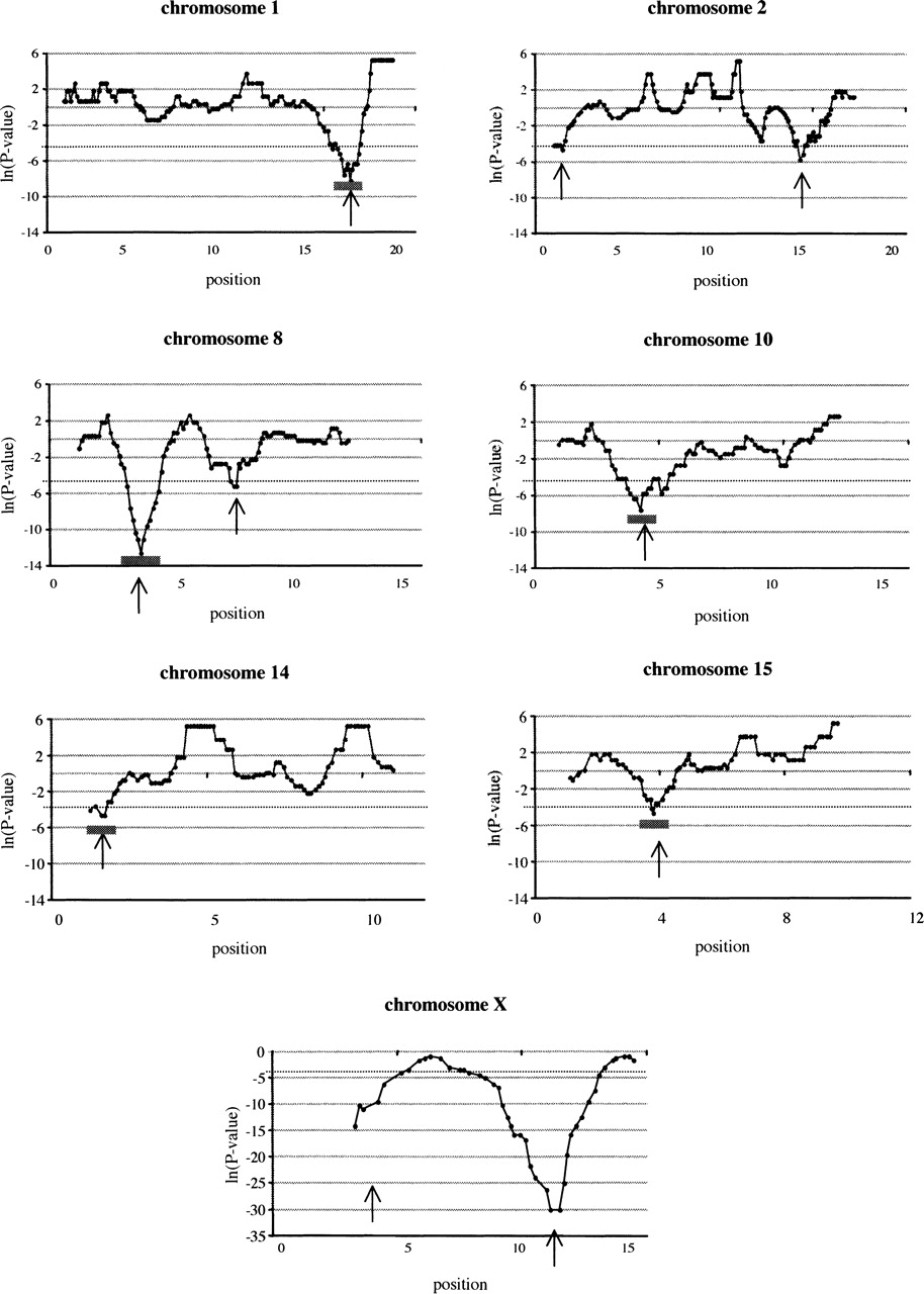 Signed ln-transformed P-values from a χ2 analysis of a sliding window plotted against chromosomal position (midpoint of a sliding window). Positive values on the y-axis indicate a deficiency in the number of fixed differences between the subspecies while negative values indicate more fixed differences than expected. Sliding windows consist of 60 SNPs moved for five SNP each step. (Dashed line) Significance level for a surplus of fixed differences among subspecies, (arrows) regions of significantly elevated differentiation, (short horizontal gray bars) regions that were chosen for direct sequencing of independent samples of M. m. musculus and M. m. domesticus. Only chromosomes where significant differentiation was found are shown. Note that the y-axis of the X chromosome differs from those of the autosomes because of the overall much higher differentiation of the X. Base positions on the x-axis need to be multiplied by 107.