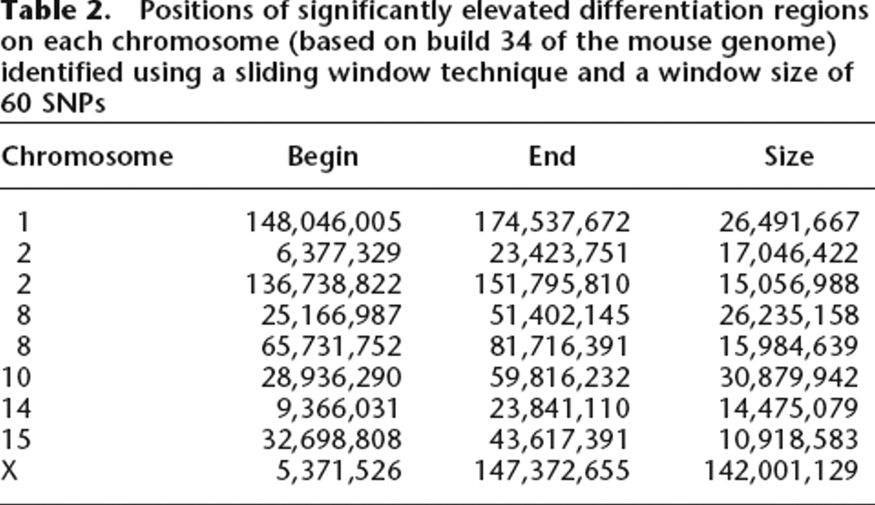 Positions of significantly elevated differentiation regions on each chromosome (based on build 34 of the mouse genome) identified using a sliding window technique and a window size of 60 SNPs