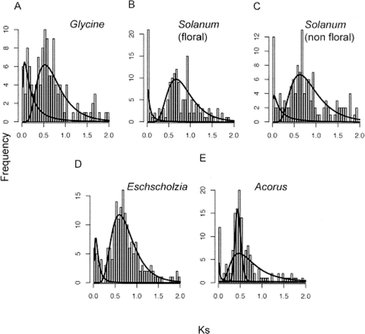 Ks distributions of paralogs in selected angiosperm species, with fitted densities from mixture model analysis, suggest paleopolyploidy in eudicots and monocots. Each fitted line indicates a subpopulation in the mixture. The first (leftmost) component corresponds to paralogs from background gene duplications; other peaks indicate estimated median Ks for ancient duplications. (A) Glycine max (soybean). (B,C) Solanum lycopersicum (tomato), data from floral tissue (B) and nonfloral tissue (C). (D) A basal eudicot, Eschscholzia californica (California poppy). (E) A basal monocot, Acorus americanus.