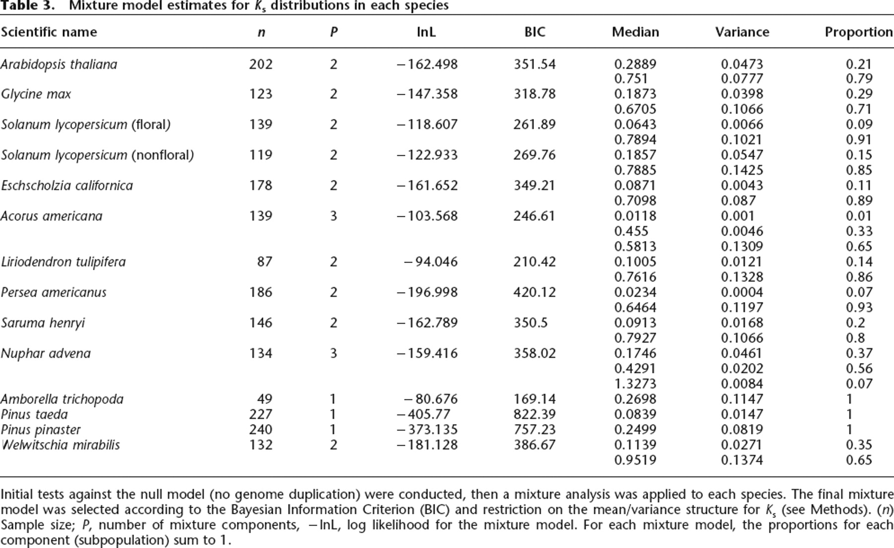 Initial tests against the null model (no genome duplication) were conducted, then a mixture analysis was applied to each species. The final mixture model was selected according to the Bayesian Information Criterion (BIC) and restriction on the mean/variance structure for Ks (see Methods). (n) Sample size; P, number of mixture components, −lnL, log likelihood for the mixture model. For each mixture model, the proportions for each component (subpopulation) sum to 1.