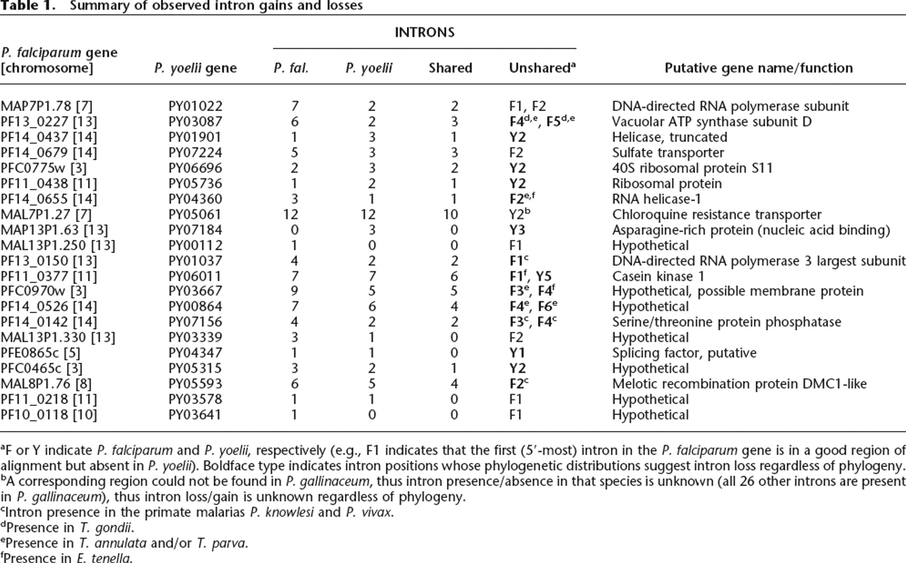 aF or Y indicate P. falciparum and P. yoelii, respectively (e.g., F1 indicates that the first (5′-most) intron in the P. falciparum gene is in a good region of alignment but absent in P. yoelii). Boldface type indicates intron positions whose phylogenetic distributions suggest intron loss regardless of phylogeny.
