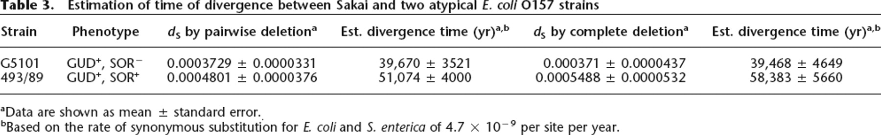 Estimation of time of divergence between Sakai and two atypical E. coli O157 strains