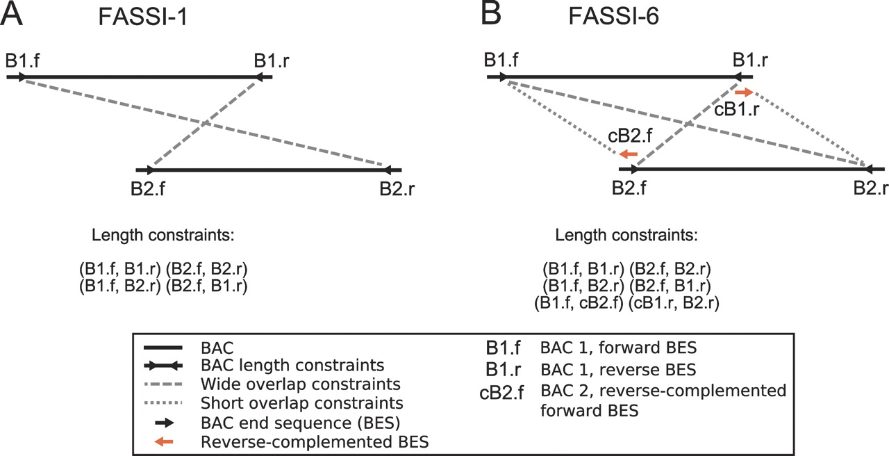 BAC length constraints derived from physical maps. (A) FASSI-1 consists of four different sets of length constraints between any two overlapping BAC neighbors (40% overlap in our implementation). In addition to introducing accurate length constraints between mate pairs of a given BAC, two additional, wide overlap constraints are introduced between neighbors. (B) Constraints in FASSI-6 include the length constraints from FASSI-1, plus short overlap constraints between any two proximal BAC end sequences from BAC sharing 40% of their length. The FASSI parameters are detailed in Methods.