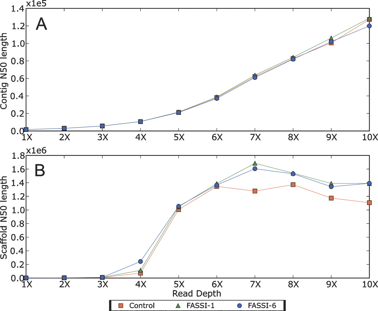 Effect of FASSI on the assembly contiguity of D. melanogaster. (A) Contig and (B) scaffold N50 length are calculated for every assembly at shotgun depths ranging from 1× to 10×.