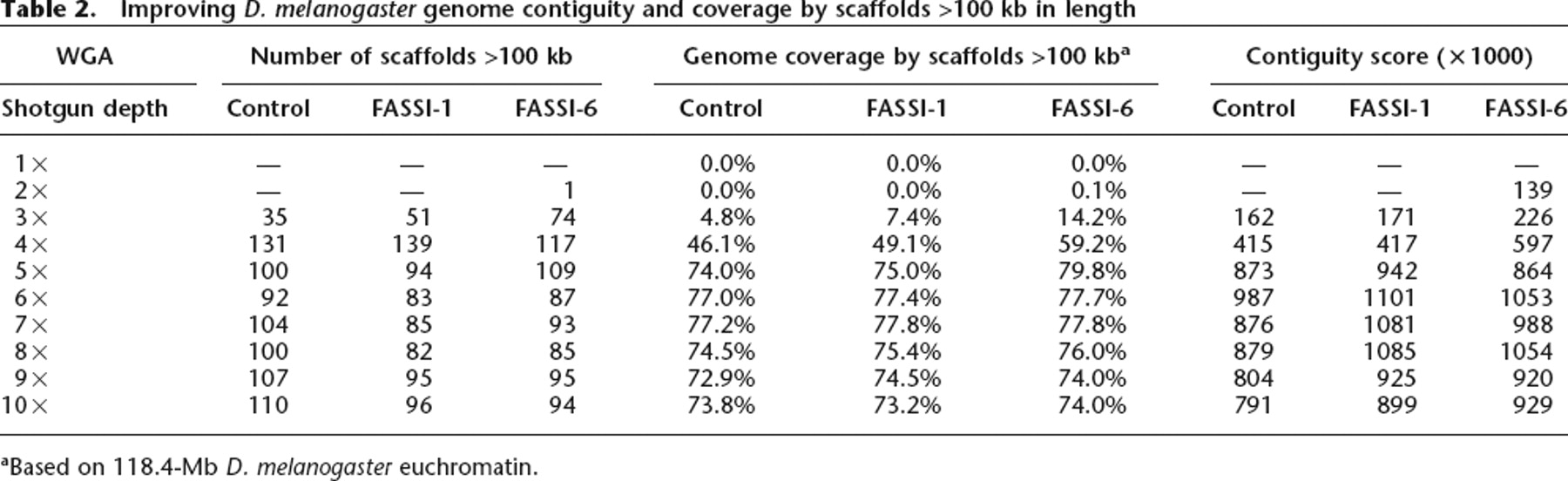 Improving D. melanogaster genome contiguity and coverage by scaffolds >100 kb in length
