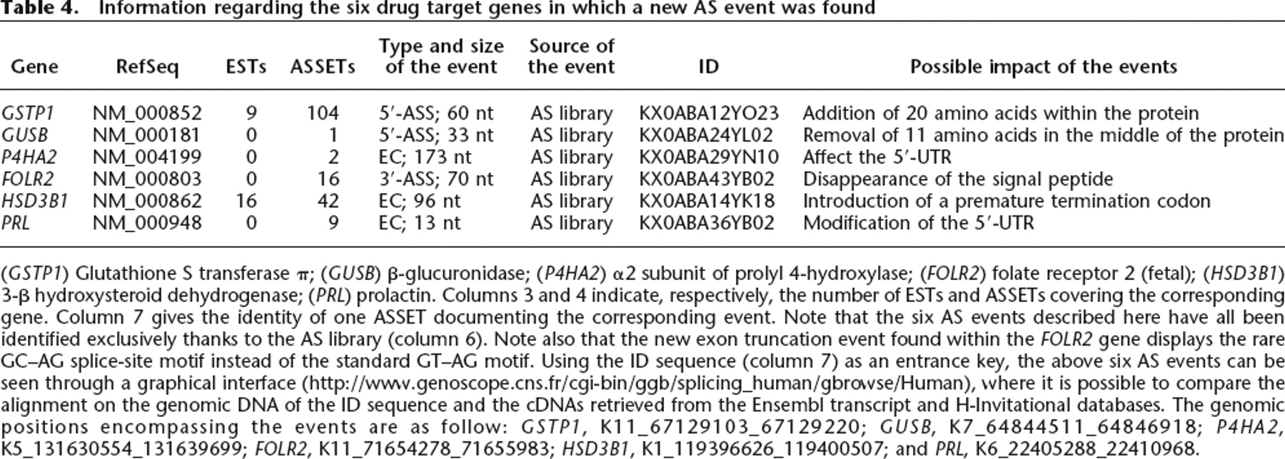 (GSTP1) Glutathione S transferase π; (GUSB) β-glucuronidase; (P4HA2) α2 subunit of prolyl 4-hydroxylase; (FOLR2) folate receptor 2 (fetal); (HSD3B1) 3-β hydroxysteroid dehydrogenase; (PRL) prolactin. Columns 3 and 4 indicate, respectively, the number of ESTs and ASSETs covering the corresponding gene. Column 7 gives the identity of one ASSET documenting the corresponding event. Note that the six AS events described here have all been identified exclusively thanks to the AS library (column 6). Note also that the new exon truncation event found within the FOLR2 gene displays the rare GC–AG splice-site motif instead of the standard GT–AG motif. Using the ID sequence (column 7) as an entrance key, the above six AS events can be seen through a graphical interface (http://www.genoscope.cns.fr/cgi-bin/ggb/splicing_human/gbrowse/Human), where it is possible to compare the alignment on the genomic DNA of the ID sequence and the cDNAs retrieved from the Ensembl transcript and H-Invitational databases. The genomic positions encompassing the events are as follow: GSTP1, K11_67129103_67129220; GUSB, K7_64844511_64846918; P4HA2, K5_131630554_131639699; FOLR2, K11_71654278_71655983; HSD3B1, K1_119396626_119400507; and PRL, K6_22405288_22410968.