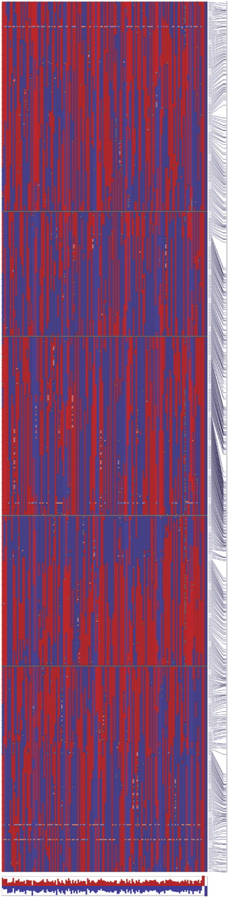 Haplotypes of 148 RILs plus parental genotypes. Each column represents a RIL (first 148 columns) or parental genotype (last four columns). Rows correspond to SFP and microsatellite markers, arranged (top to bottom) in physical order based on the Col-0 genomic sequence. The five Arabidopsis linkage groups are laid end-to-end and are separated by horizontal gray lines. Red boxes indicate Sha genotypes, blue boxes indicate Bay-0 genotypes, and gray boxes indicate markers scored as missing data. The final column depicts the physical distances between the markers. Below the haplotypes, the proportions of Sha (red bars) and Bay-0 (blue bars) alleles in each RIL are depicted. (A high resolution version of this figure, with marker names included, is available in Supplemental Fig. 6a)