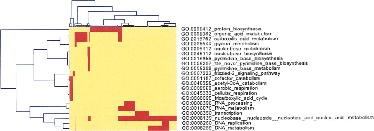 Clustered Image Map of genes with no paralog versus GO categories for categories with significant enrichment. Thumbnail clustered image map (CIM) of genes (top) versus categories (right) for categories with a false discovery rate (FDR) ≤0.10. Very large generic categories have been removed to improve visualization. Clustering was performed with the Genesis Client (Sturn et al. 2002; http://genome.tugraz.at/Software/GenesisCenter.html). Three major clusters can be seen. Processes involved in general metabolism (far left) include “cofactor catabolism,” “acetyl-CoA catabolism,” “aerobic respiration,” “cellular respiration,” and “tricarboxylic acid cycle.” Processes involved in nucleic acid processing (bottom right) include “RNA metabolism,” “transcription,” “nucleobase metabolism,” “DNA replication,” and “DNA metabolism.” The third cluster contains GO categories involved in nucleoside metabolism such as “nucleobase metabolism,” “pyrimidine base biosynthesis,” and “nucleobase biosynthesis.” The full-size CIM in which all genes are displayed is available as Supplemental Figure S6.
