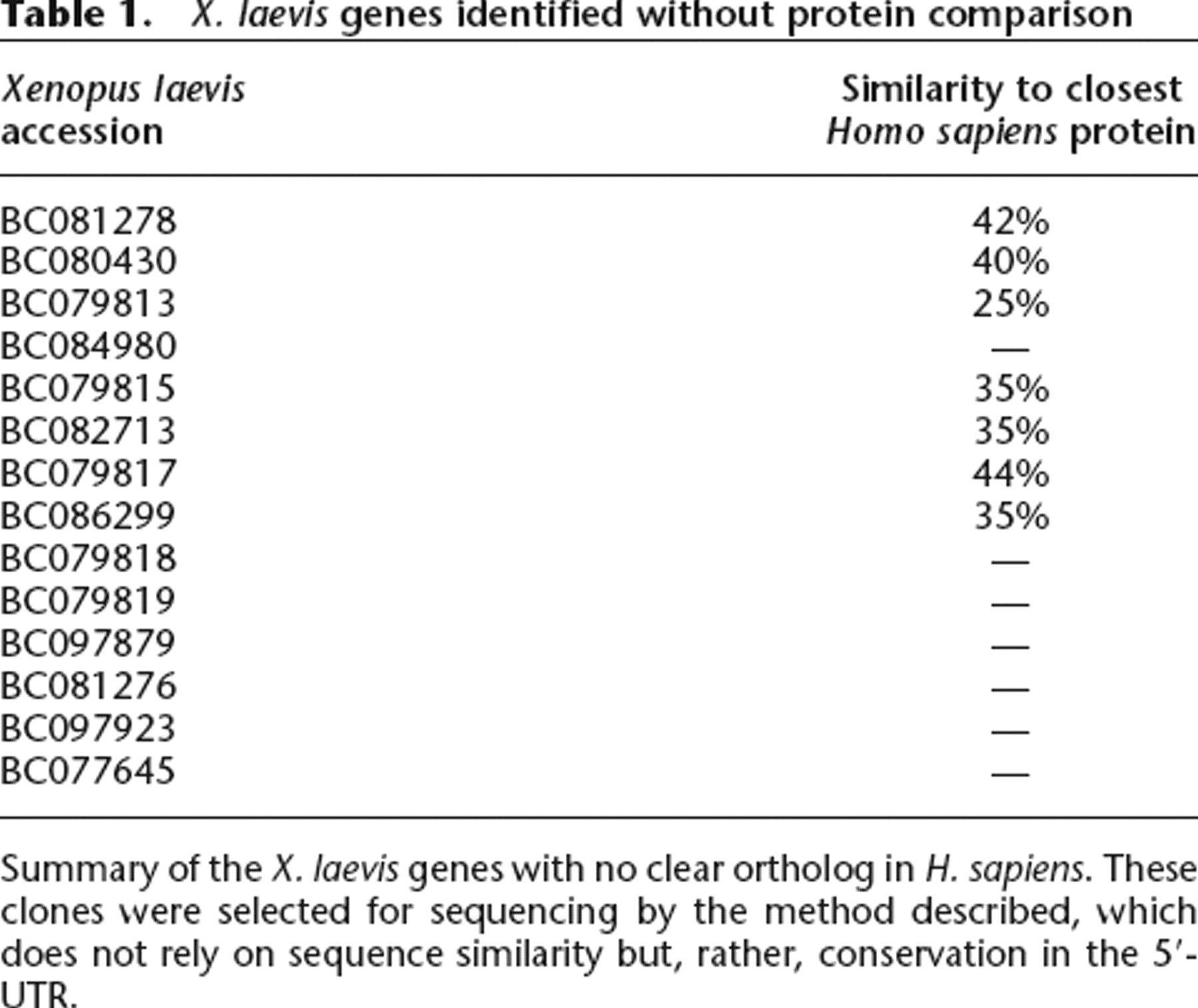 Summary of the X. laevis genes with no clear ortholog in H. sapiens. These clones were selected for sequencing by the method described, which does not rely on sequence similarity but, rather, conservation in the 5′-UTR.
