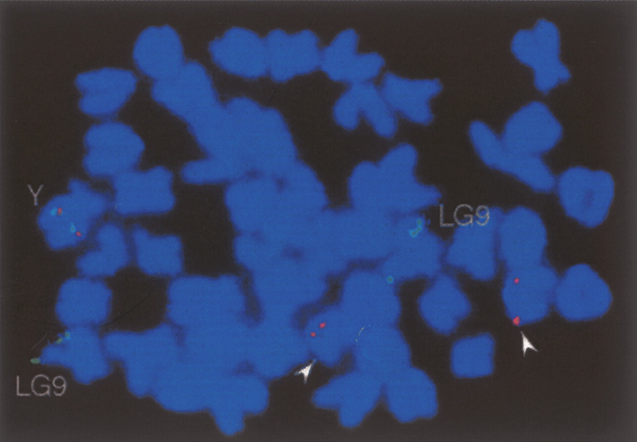 Location of repetitive elements found on the Y chromosome. A metaphase from a male fish showing the hybridization signals for dmrt1a and dmrt1bY (green signals), and the repetitive elements (335-bp, 338-bp, 363-bp, and 551-bp repeat) (red signals). These repetitive elements were initially identified on the Y chromosome in the Y-specific region. Red signals are located together with the green signal on the Y chromosome (Y), but are also detected on another pair of acrocentric chromosomes (arrowheads). The green signals at the tip of another pair of chromosomes represent the autosomal (LG9) dmrt1a gene. Consistent with the nucleotide sequence analyses, the repeats are not found on the X chromosome nor colocalize with the autosomal dmrt1a.