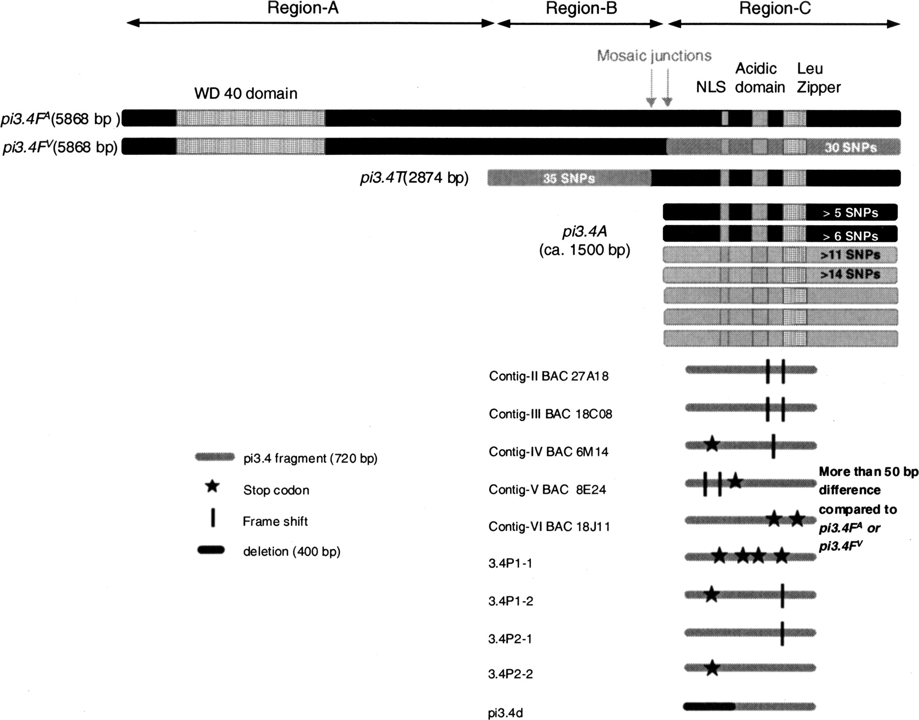 Mosaic structure in Pi3.4F. pi3.4FA, pi3.4T, and pi3.4A are copies present in the avirulent haplotype. pi3.4FV is derived from the virulent haplotype. The size of pi3.4A is estimated from transcript lengths. From various pi3.4A copies 720 bp were sequenced, and the number of SNPs detected in these 720 bp fragments is indicated. Sequences derived from other loci carry frame shifts and stop codons, or have deletions. For alignments see Supplemental Figures S1, S2.