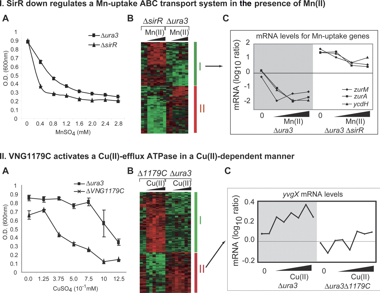 Transcriptional control of resistance to Mn(II) and Cu(II). (I.) SirR is a Mn(II)-dependent repressor of the Mn-uptake ABC transport system genes—zurA, zurM, and ycdh. (A) Effect of Mn(II) on survival of the ΔsirR strain relative to the parent Δura3 strain. Growth was measured as increase in cell density (OD600) after culturing for 27 h at 37°C in the presence of increasing concentrations of Mn(II). (B) Ninety differences in transcriptional responses to Mn(II) in the ΔsirR strain relative to the parent Δura3 strain were determined using the SAM algorithm (Tusher et al. 2001) (Supplemental Fig. 6), normalized (variance = 1; mean = 0) and hierarchical clustered (Euclidean distance/Average Linkage). (C) Normalized log10 ratios of mRNA level changes for zurA, zurM, ycdH, (identified in group I in the two hierarchical clusters in B in the absence and presence of Mn(II) in Δura3 and ΔsirR strain backgrounds. Transcript levels for these ABC transporter subunits are down-regulated in the presence of SirR and Mn(II). (II.) VNG1179C is a Cu(II)-dependent activator of the Cu(II)-efflux ATPase YvgX. (A) Effect of Cu(II) on survival of ΔVNG1179C strain relative to the parent Δura3 strain. Survival was measured as described above, but with increasing doses of Cu(II) instead of Mn(II). (B) A total of 139 differences in transcriptional response to Cu(II) in the ΔVNG1179C strain relative to the parent Δura3 strain were filtered, normalized, and clustered as described in B (SF2). (C) yvgX was identified among genes in group II of the two main hierarchical clusters. Raw log10 ratios of mRNA level changes for yvgX in the absence and presence of Cu(II) in the Δura3 and ΔVNG1179C strain backgrounds indicate that it is up-regulated only in the presence of both Cu(II) and VNG1179C.
