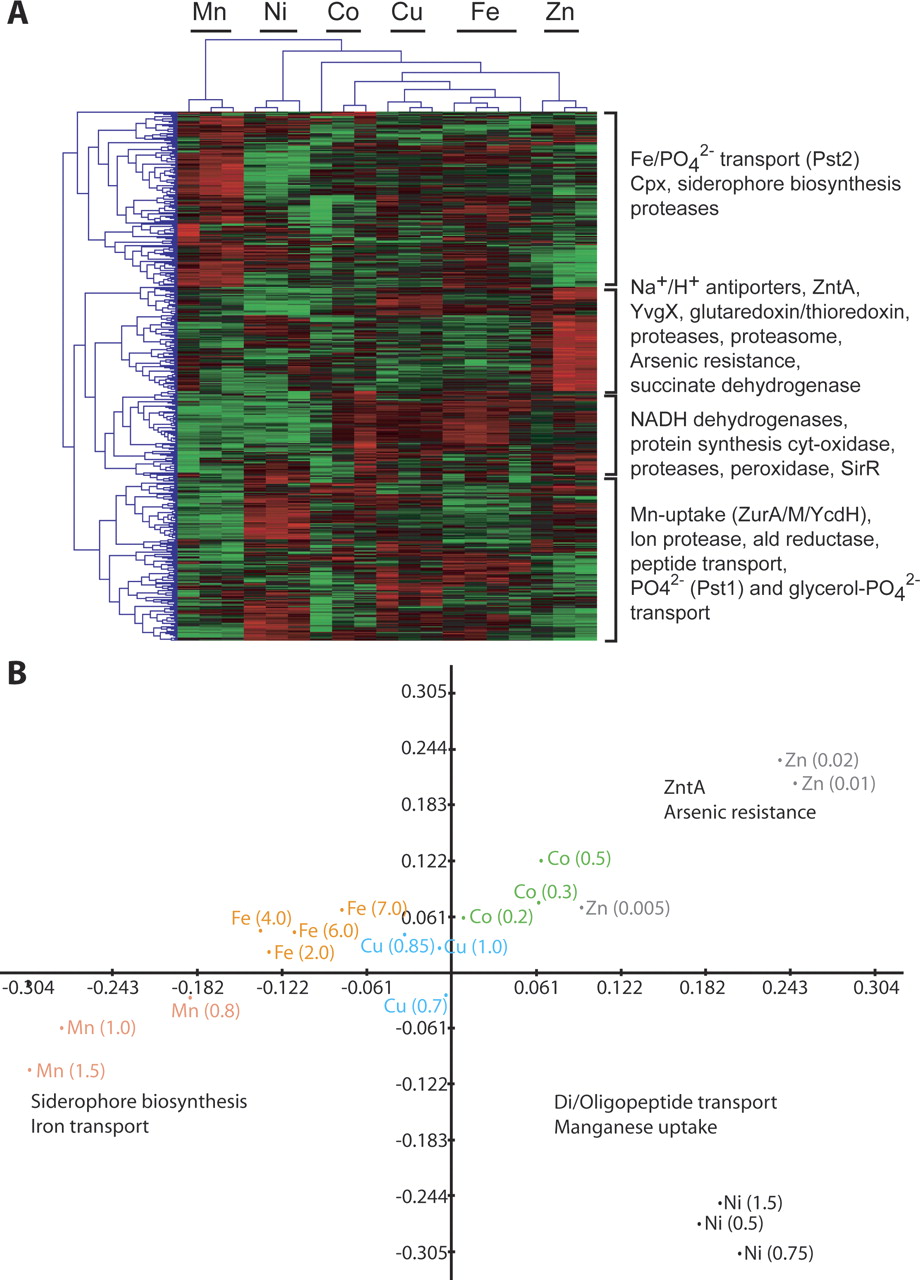 Correlation among responses to different transition metals. (A) Hierarchical clustering on normalized mRNA log10 ratios for 468 genes that changed significantly (λ > 15) in at least two conditions. (B) Correspondence analysis on the same data set illustrates relatedness among both experiments as well as genes (for sake of clarity, genes are not shown; instead, relative positions of some key functions are highlighted on the plot). Each dot in this graph represents an experiment; for example, Co (0.5) refers to mRNA level changes in 0.5 mM Co2+. Eigen values are plotted for each of the first two dimensions, indicated as Axes 1 and 2, which represent inertia values of 26.34 and 19.45, respectively.