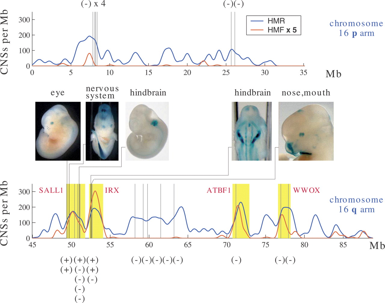 Extreme human–rodent CNSs with no conservation in fish identify enhancers at e11.5–12.5 only in certain genomic regions. Upper and lower plots: human–rodent (blue) and human–mouse–fish (scaled by a factor of 5, red) CNS density on the p (upper) and q (lower) arms of human chromosome 16. We tested 24 human–rodent CNSs with P-value < 1e-40 and no conservation in fish (locations marked by vertical lines) for enhancer activity at embryonic day 11.5–12.5. The five enhancers thus identified were located exclusively in two of the four loci with the highest human–mouse–fish CNS density on the chromosome (yellow bands). These loci contain developmentally regulated genes, all but one of which are transcription factors.