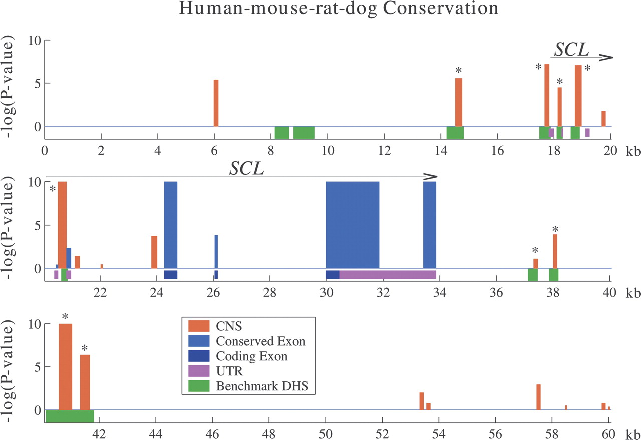 SCL locus: Benchmarking eutherian sequence comparison against empirical data. The displayed 60-kb genomic region contains the SCL gene and its flanking intergenic regions. Human–mouse–rat–dog CNSs (red) and exonic (blue) conserved regions identified by Gumby (P-value ≤ 0.5) are shown as vertical bars. The nine CNSs marked with asterisks identify 8/10 benchmark sequence elements with empirical evidence of cis-regulatory function (green rectangles). Additionally, there are 11 new predictions at this P-value threshold.