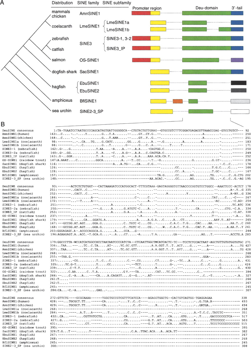 The structure and distribution of DeuSINEs. (A) Schematic representation of DeuSINEs and the known phylogenetic relationships between the host species. All of these SINEs were newly characterized in this study except for zebrafish SINE3 and sea urchin SINE2-3_SP. Green boxes represent common sequences among DeuSINEs, and an alignment of the region is shown in B. Yellow and red boxes denote promoter regions derived from tRNA (see Fig. 2A) and 5S rRNA (Fig. 2B), respectively. The regions denoted by yellow boxes in 5S rRNA-derived SINEs (AmnSINE1, SINE3, SINE3_IP and OS-SINE1) are similar to tRNA-derived promoter regions of LmeSINE1 (see Fig. 3 for details). Blue boxes represent 3′-tails of SINEs that are similar to that of zebrafish CR1-4_DR LINE (Fig. 4A), whereas the purple box is similar to that of the rainbow trout RSg-1 LINE (Fig. 4B). The 3′-tail sequences of EbuSINE1, EbuSINE2, BflSINE1, and SINE2-3_SP are distinct and of unknown origin. (B) Alignment of the common central DeuSINE sequences (Deu-domain; green boxes in A) in different host organisms. The SINE3-1 and the SINE3-2a sequences represent two subfamilies of the zebrafish SINE3 family. The top sequence is a consensus of the DeuSINE domain. Dots indicate nucleotides identical to those in the consensus sequence, and dashes indicate gaps inserted to improve the alignment.