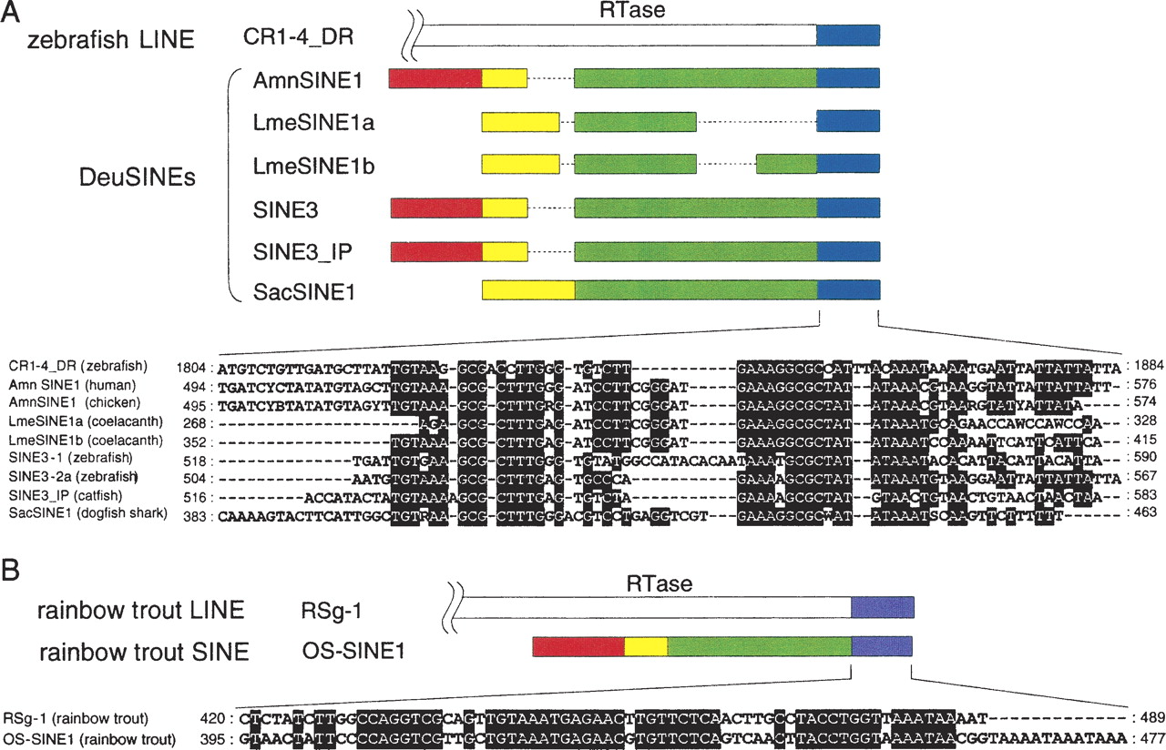 Alignment of the consensus 3′-tail sequences of DeuSINEs with that of the corresponding LINEs. “RTase” denotes the reverse-transcriptase encoded by LINEs. (A) The 3′-tail sequences of AmnSINE1, LmeSINE1a, LmeSINE1b, SINE3, SINE3_IP, and SacSINE1 (blue boxes) are similar to that of zebrafish CR1-4_DR LINEs. (B) The 3′-tail of OS-SINE1 (purple box) is similar to rainbow trout RSg-1 LINE. Both CR1-4_DR and RSg-1 LINE sequences were obtained from Repbase Update database (Jurka 2000).