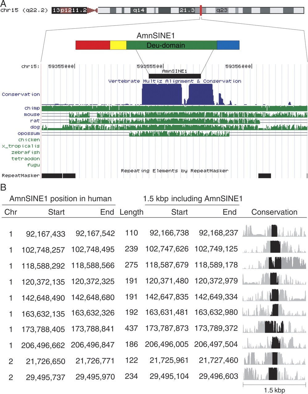 Evidence for purifying selection on AmnSINE1 in mammals. (A) An example of conserved AmnSINE1 locus (the window is chr15:59,354,815-59,356,314 in which the AmnSINE1 position is located at chr15:59,355,417-59,355,712) obtained from UCSC Genome Bioinformatics Web site. Note that the AmnSINE1 sequence is conserved in all mammals including opossum. (B) The location and conservation of 10 representative AmnSINE1 loci in human. The position information in human was determined from genomic sequence data in UCSC Genome Bioinformatics (ver. hg17). (Chr) Chromosome number. PhastCons conservation scores of the 1.5-kbp region around and including each AmnSINE1 were obtained by comparing human, chimpanzee, mouse, rat, and dog sequences, and the graphs are displayed for each locus. In each graph, the black region denotes the AmnSINE1 sequence and the gray represents the flanking region corresponding to the given position. Detailed information for the 10 loci is available in Supplemental Figure 3.