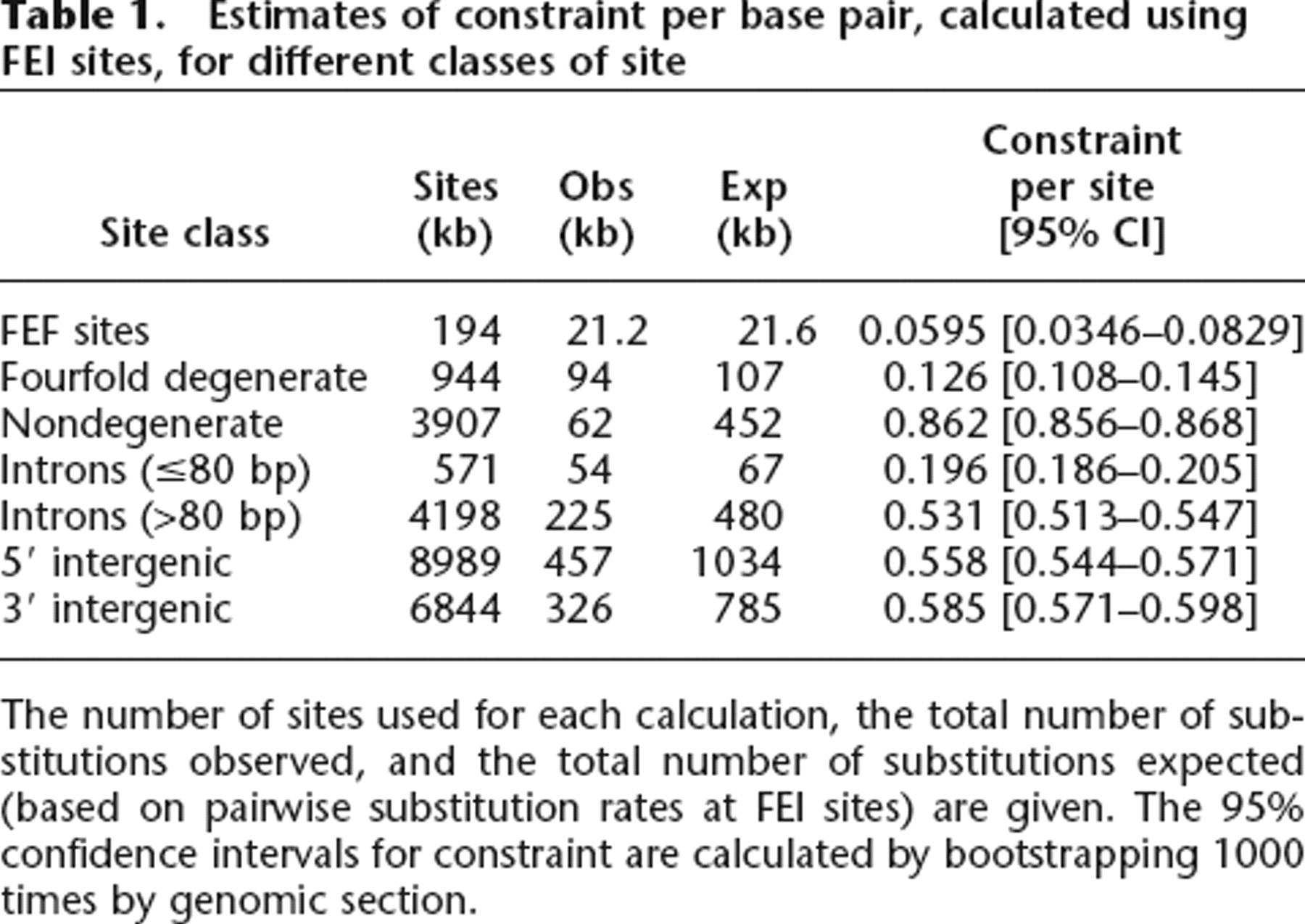 Estimates of constraint per base pair, calculated using FEI sites, for different classes of site