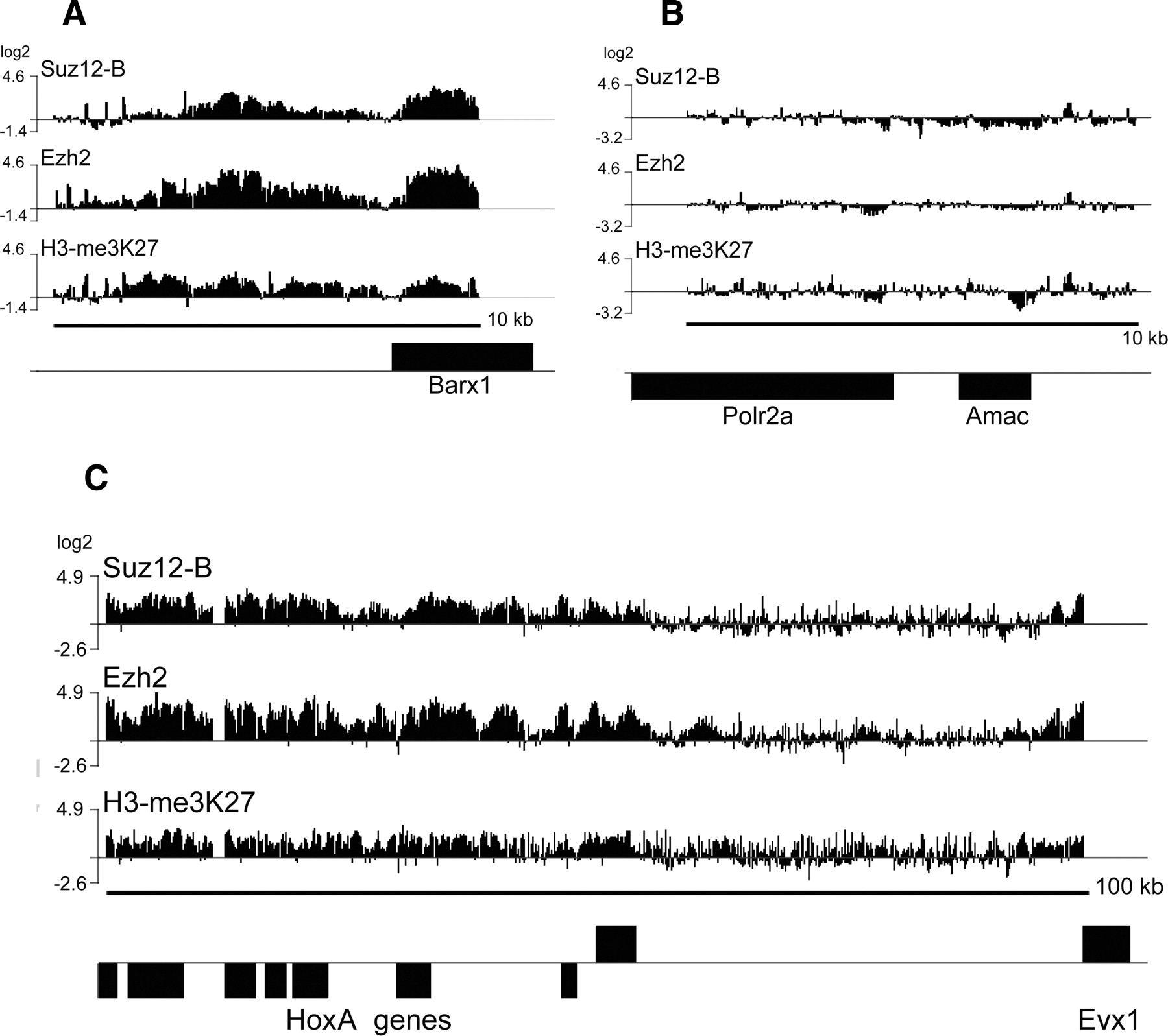 Custom ChIP-chip analysis of mouse F9 cell Suz12 target promoters. Custom ChIP-chip analysis using mouse F9 cells of (A) a 10-kb region of a Suz12 target gene, (B) a 10-kb region of the negative control RNAPII promoter, or (C) a 100-kb region of the HoxA cluster.