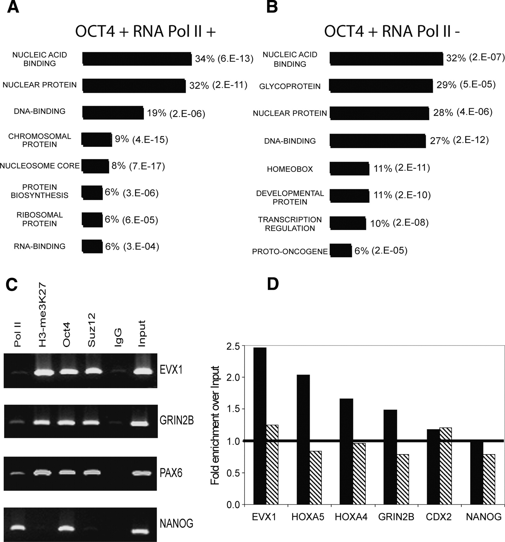 Promoters bound by both SUZ12 and OCT4 in Ntera2 cells. DAVID analysis of the set of (A) OCT4+ RNAPII+ and (B) OCT4+ RNAPII− promoters in Ntera2 cells. Shown in parentheses are the P-values, which indicate the probability that the category has been identified by random chance. The entire list of OCT4 targets (having known function) can be found as Supplemental Table S8. (C) PCR analysis of amplicons prepared from Ntera2 ChIP samples obtained using antibodies to the indicated proteins. The NANOG promoter was used for a known OCT4 target gene; NANOG was not expected to be bound by SUZ12 because it is expressed at high levels in Ntera2 cells (i.e., it is an OCT4+ RNAPII+ promoter target). (D) PCR analysis of amplicons prepared from SUZ12 ChIP samples after siRNA-mediated knockdown of OCT4 (hatched bars) or introduction of a control siRNA (black bars) in Ntera2 cells. The horizontal black bar indicates the SUZ12/Total ratio that is expected for nontarget promoters such as NANOG (nontarget genes should show a ratio of ∼1 when equivalent amounts of amplicons prepared from ChIP and total samples are analyzed).