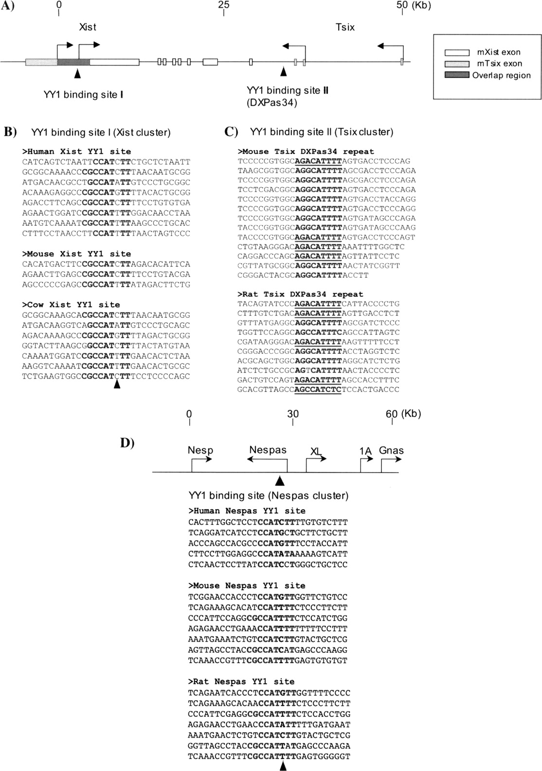 Three clustered YY1 binding sites located in the Xist/Tsix and Nespas loci. (A) The genomic structure of the Xist/Tsix locus. The arrows indicate the direction of Xist and Tsix transcription, and each gene has two different transcription start sites. The arrowheads indicate the positions of two clustered YY1 binding sites. (B,C) The conservation patterns of two clustered YY1 binding sites, the Xist cluster and the Tsix cluster. The two divergent motifs found in the Tsix clusters are marked: one with an underline and the other without an underline. (D) The genomic structure of the Gnas-imprinted domain and the conservation patterns of the clustered YY1 binding site located in the first intron of Nespas. The nucleotide bases are in boldface type if the sequences of each binding motif are identical to the consensus sequence of known YY1 binding sites.