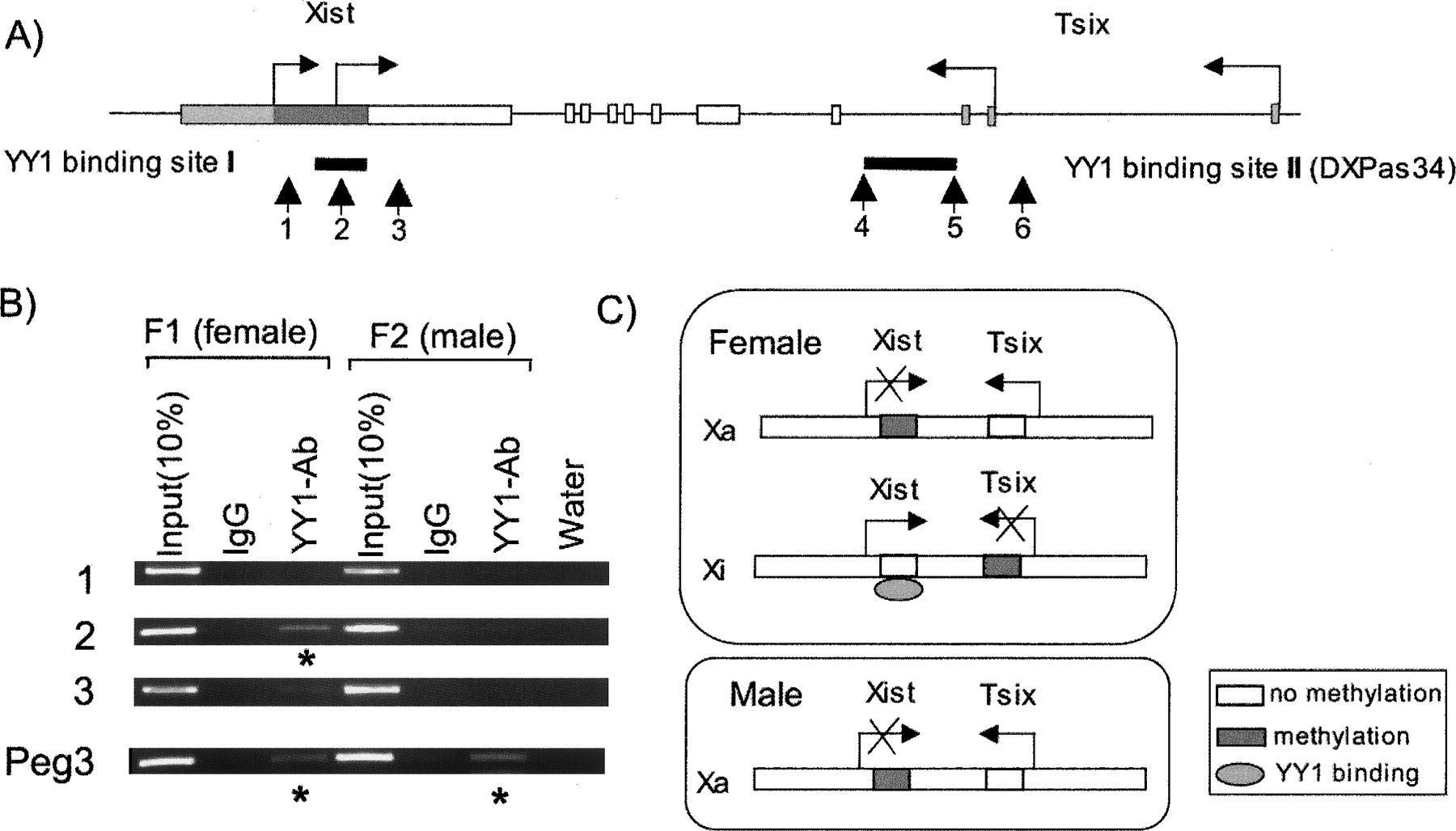Allele-specific binding of YY1 to the Xist and Tsix clusters. A) The in vivo YY1 binding to each cluster was tested with three primer sets, and the positions of these are indicated with arrows with numbers. (B) Female-specific binding of YY1 to the Xist cluster. Two mouse brain tissues from female (F1) and male (F2) were used for our ChIP experiments. Our ChIP analyses included two control DNAs: 10% of the Input DNAs from F1 (lane 1) and F2 (lane 4) and the immunoprecipitated DNA with preimmune serum (lanes 2 and 5). Our ChIP analyses used the Peg3 locus as an internal control for female- and male-derived ChIP DNAs as shown in the bottom. Asterisks indicate the regions enriched by YY1-Ab. (C) Schematic representation of allele-specific YY1 binding to the Xist locus based on the results of B. YY1 binds to the Xist cluster located in the Xi of female, which is unmethylated. Because of the repeat structure of the Tsix cluster, however, our ChIP analyses could not confirm the in vivo YY1 binding to this locus. The methylation status of Tsix reflects the gametic difference between two sexes before the onset of random XCI (X chromosome inactivation). For the imprinted XCI in female, Xa is from oocytes (maternal) while Xi is from sperm (paternal).
