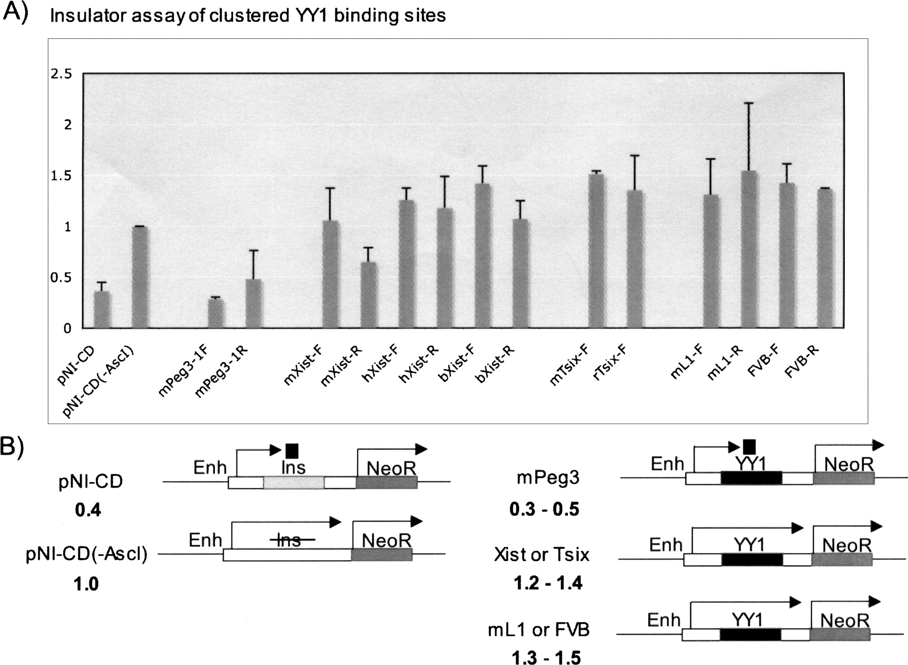 Insulator assay of the clustered YY1 binding sites. For insulator assays, the testing DNA fragments were positioned between an erythroid-specific enhancer (Enh) and a promoter directing the transcription of a reporter, neoR, as shown in B. This test used two control vectors: pNI-CD(-AscI) without any insulator and pNI-CD with a chicken insulator. The genomic fragments containing clustered YY1 binding sites were subcloned into the AscI site of the pNI-CD vector with two different orientations, forward (-F) and reverse (-R). The DNA fragments for the clustered sites of Xist and Tsix were derived from mouse (m), human (h), cow (b), and rat (r). Each fragment was tested more than three times, and the averaged values with standard errors are shown in A. The overall patterns observed in this series of experiments are summarized schematically in B with averaged values shown below the name of each construct.