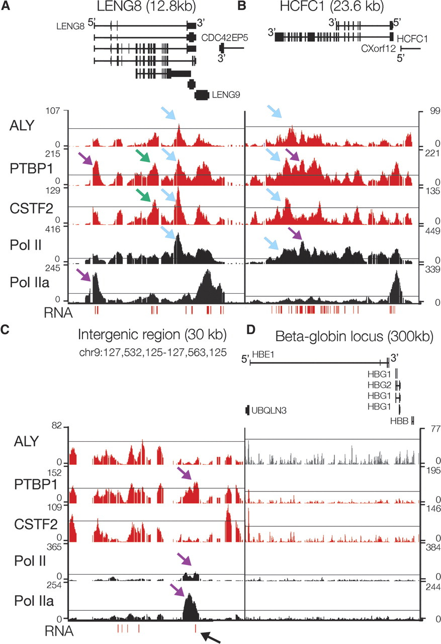High resolution mapping of ALY, PTBP1, CSTF2, Pol II, Pol IIa, and RNA shows accumulation at distinct sites. Pol II sites were determined using an antibody, 4H8, that recognizes both phosphorylated and unphosphorylated RNA polymerase II. Pol IIa sites were determined using an antibody, 8WG16, which recognizes primarily unphosphorylated RNA polymerase II. RNA was reverse-transcribed with random primers and the resulting cDNA was probed on the tiled ENCODE arrays. Representative plots of –10 log (P-value) across LENG8 (A), HCFC1 (B), an intergenic region (C), and the β-globin locus (D). Schematics of the genes from the known genes database are shown and labeled at the 5′ end to indicate the direction of transcription of each gene. The thin line in each plot marks a P-value of 10−6 except for ALY, where it marks a P-value of 10−5. Blue arrows highlight sites where RNA binding proteins were similar to other RNA binding proteins as well as RNA Pol II, purple arrows highlight sites where RNA binding proteins were different than one another, green arrows highlight sites where there was RNA binding protein enrichment in the absence of significant RNA Pol II accumulation, and the black arrow highlights an unannotated loci where PTBP1, RNA Pol II, and RNA signal were observed.