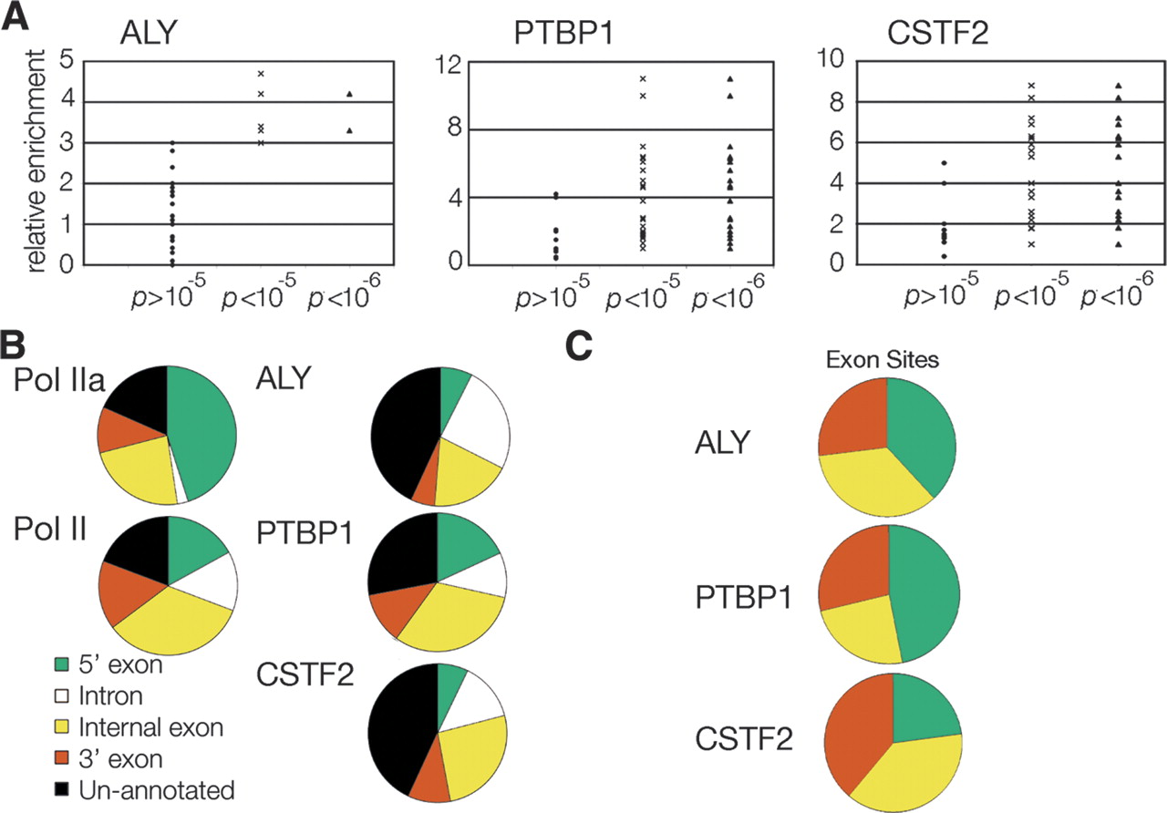 Analysis of array data showed P < 10−6 were significant and annotation of these sites revealed unique patterns and biases. (A) PCR validation of array data, performed with PCR assay used in Figure Figure 1. Each point in the scatter plots represents a PCR validation. (B) RefSeq site annotation of sites enriched for RNA polymerase II, ALY, PTBP1, and CSTF2. Sites were annotated as being 5′ exons, introns, internal exons, 3′ exons, and unannotated as described in Methods. Numbers for each annotation are in Table 1. (C) Exon biases of RNA binding proteins. The percent of each protein’s exons that are 5′, 3′, or internal (by default) was determined and plotted on a pie chart to illustrate factor biases.