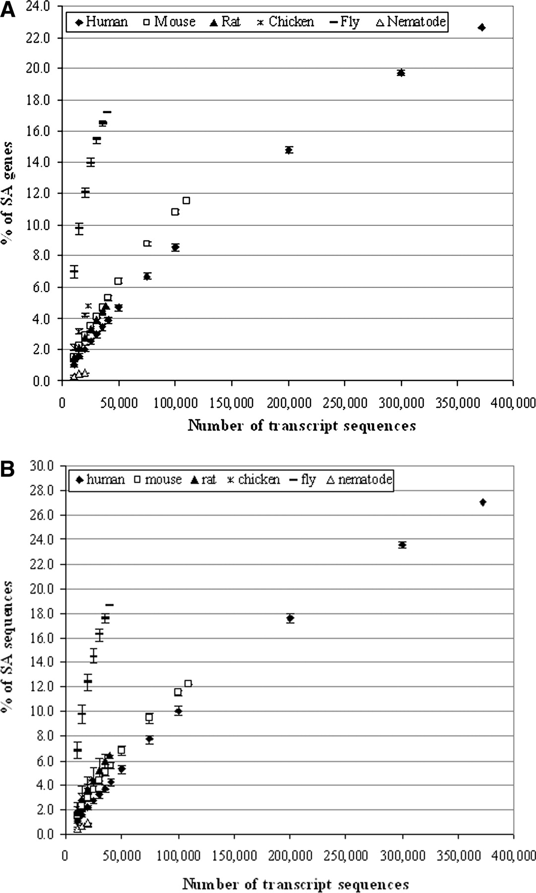 Relationship between the number of qualified transcripts and the estimated proportion of SA genes or sequences. We randomly selected a set number of sequences from the whole qualified transcript sequence data set for each genome (see Supplemental Table 1) and then followed the same procedure (see Methods) to estimate the SA gene/sequence proportion. For each number of transcripts, we repeated the analysis independently 1000 times. The mean values with their standard deviation (mean ± SD) are shown. “% of SA genes/sequences” refers to the proportion of genes/sequences involved in putative antisense transcription (i.e., forming putative SA pairs) in a given gene/sequence data set. (A) Relationship between the number of qualified transcripts and the estimated proportion of SA genes. (B) Relationship between the number of qualified transcripts and the estimated proportion of SA sequences.