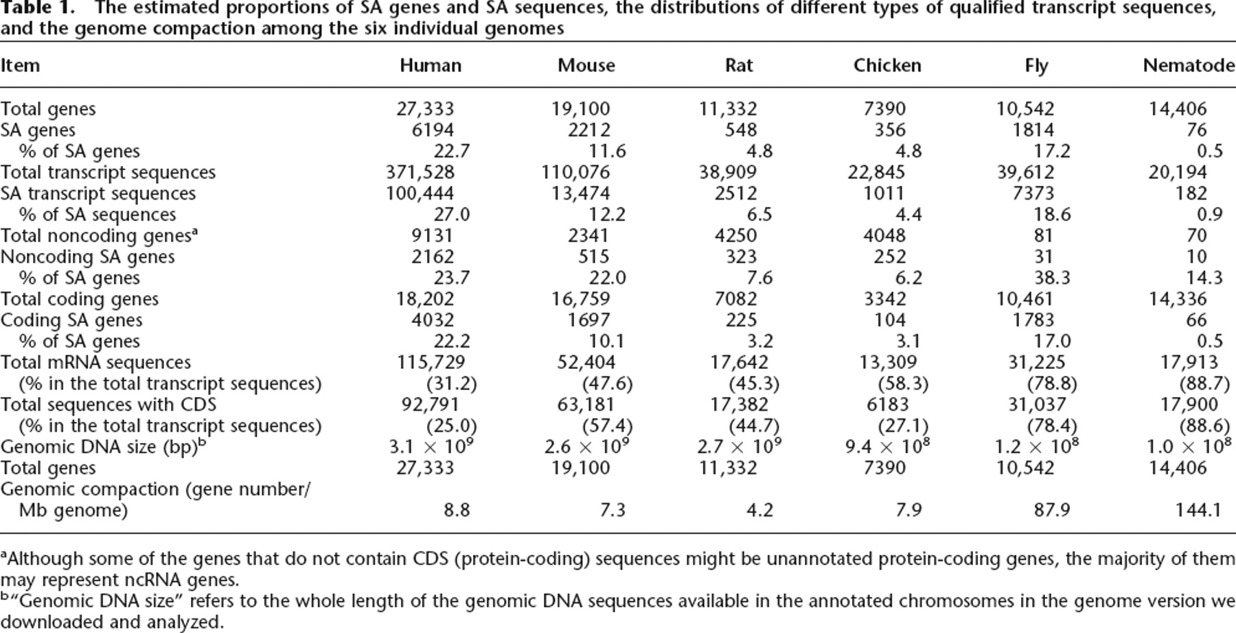 The estimated proportions of SA genes and SA sequences, the distributions of different types of qualified transcript sequences, and the genome compaction among the six individual genomes