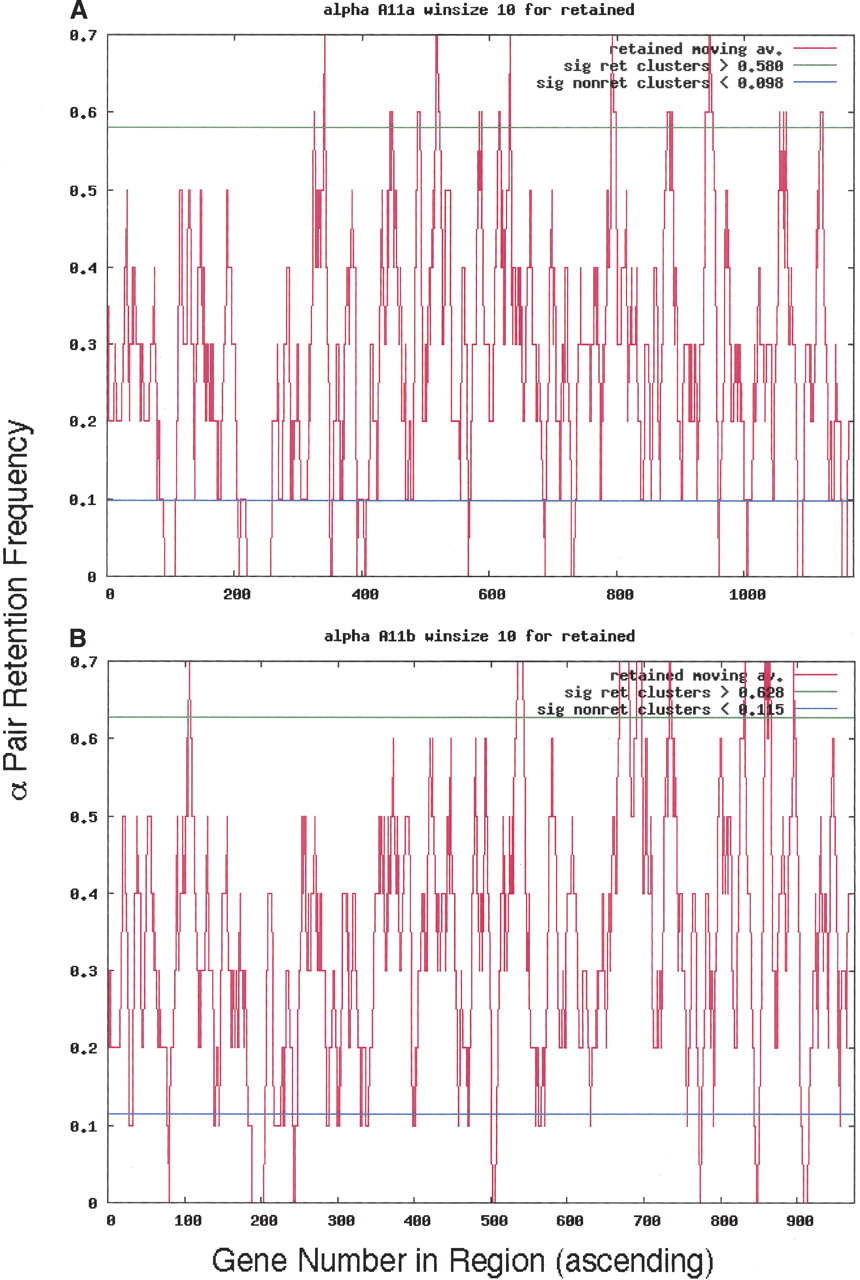 Moving average cluster plots for both α11 homeologous chromosomal segments using a 10-gene window. (A) Homeolog 11a. (B) Homeolog 11b. The y-axis is retention frequency; 1.0 means that all 10 genes were retained in that window. The x-axis is the sequence of genes in the Minimized α-region homeolog, as explained in Methods. In α11a, for example, there are 67 and 92 genes, retained and non-retained genes, respectively (Table 1, Row 11, columns “Genes >95%” and “a”).