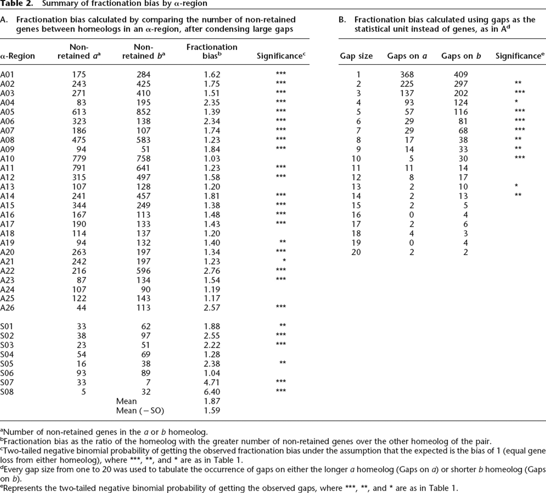 cTwo-tailed negative binomial probability of getting the observed fractionation bias under the assumption that the expected is the bias of 1 (equal gene loss from either homeolog), where ***, **, and * are as in Table 1.