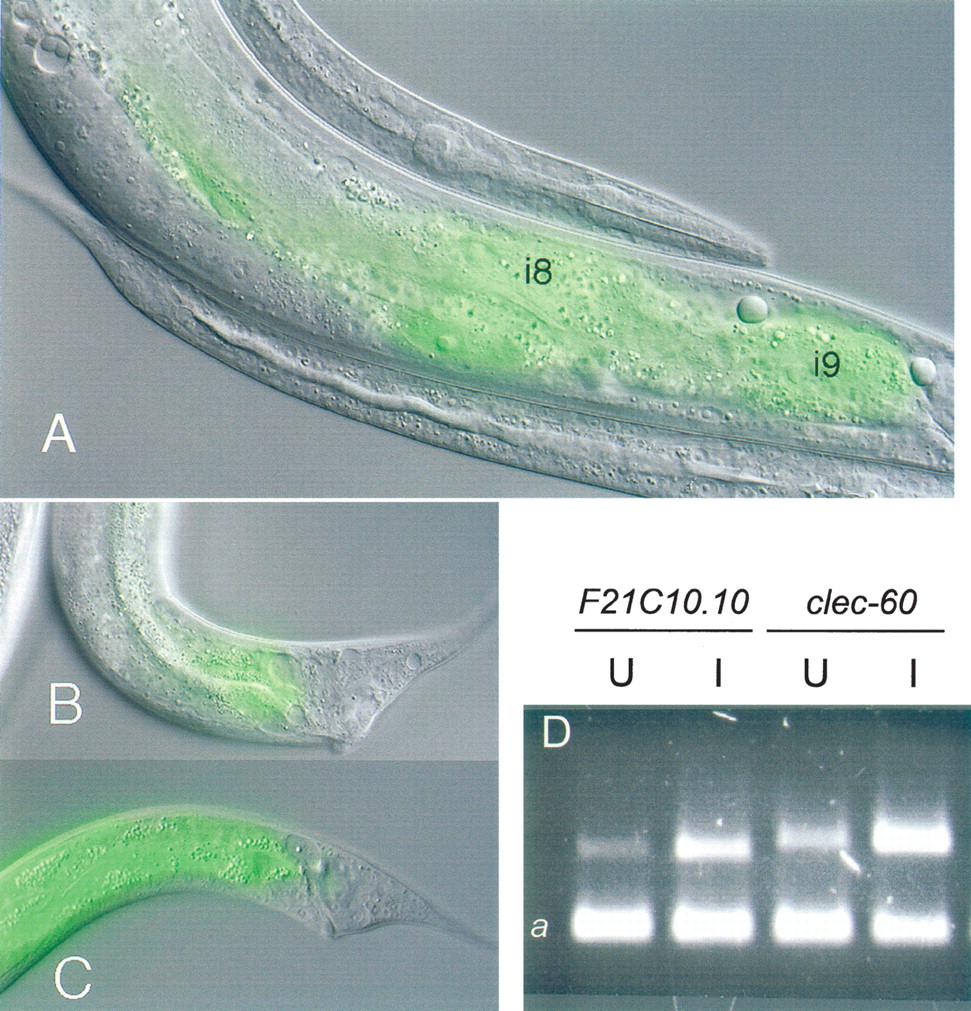 Expression of the C-type lectin gene clec-60. A promoter fusion, clec-60p::GFP, was expressed in adults in the posterior intestine cells, int-8 (i8) and int-9 (i9) on both OP50 (A) and MBL plates (B,C). The variation in the intensity and extent of the GFP signal within infected worms is evident in B and C. (D) RT–PCR experiment showing F21C10.10 and clec-60 (top bands) expression compared with ama-1 (control, bottom band a) in uninfected (U) and infected (I) worms.