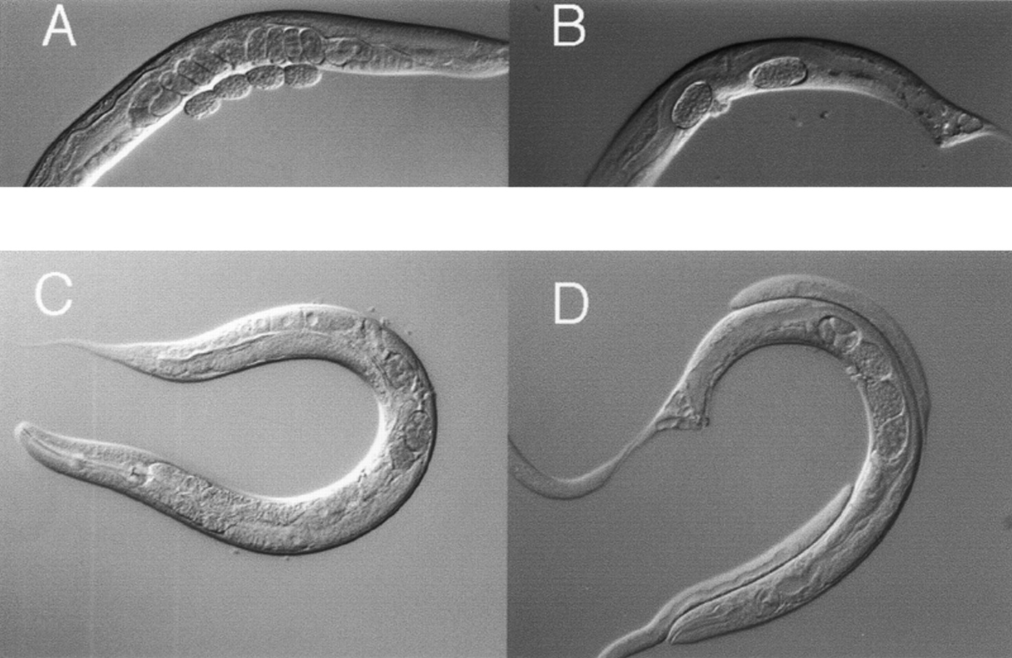 Lys-7 worms grown on MBL are severely constipated and developmentally delayed. Two mutants of lys-7, RB1286 (ok1385) and RB1285 (ok1384) were grown on MBL plates. Both lys-7 alleles were severely constipated, had a strong Dar response, and a developmental delay, such that most of the population arrested at the L3 larval stage. (A) RB1285 on OP50; (B) RB1285 on MBL; (C) RB1286 on OP50; (D) RB1286 on MBL.