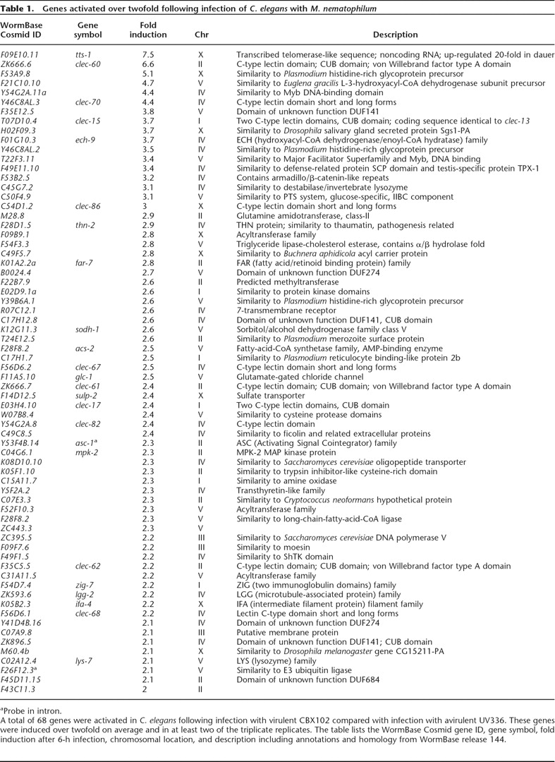 Genes activated over twofold following infection of C. elegans with M. nematophilum