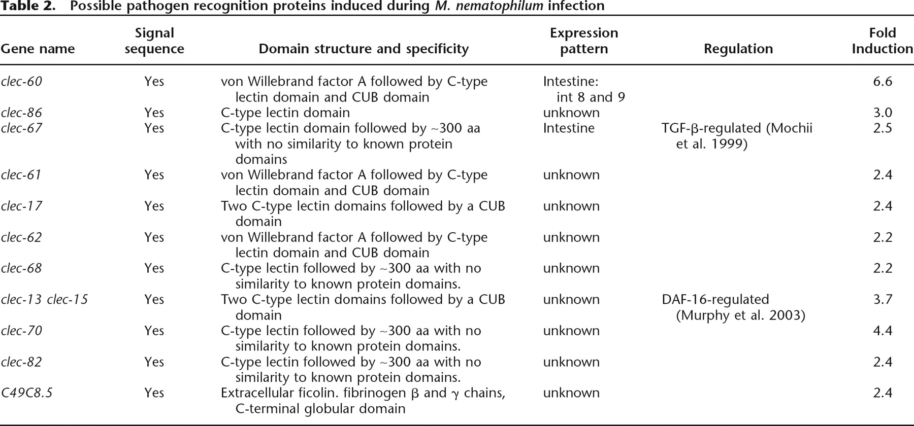 Possible pathogen recognition proteins induced during M. nematophilum infection
