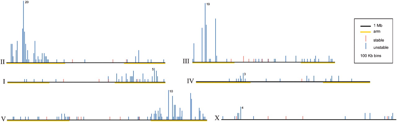 F-box family genome positions. The genome positions of 27 highly conserved (red) and 415 unstable (blue) F-box-containing genes in C. elegans. Striking clustering is apparent only for the unstable genes, consistent with evolution by local gene duplication. Highly conserved genes include all 23 ortholog trios plus four genes that did not have specific one-to-one orthologs because of a single duplication or loss in one species. Gene bins are 100 kb in length, and the number of genes in the largest bin on each chromosome is indicated.