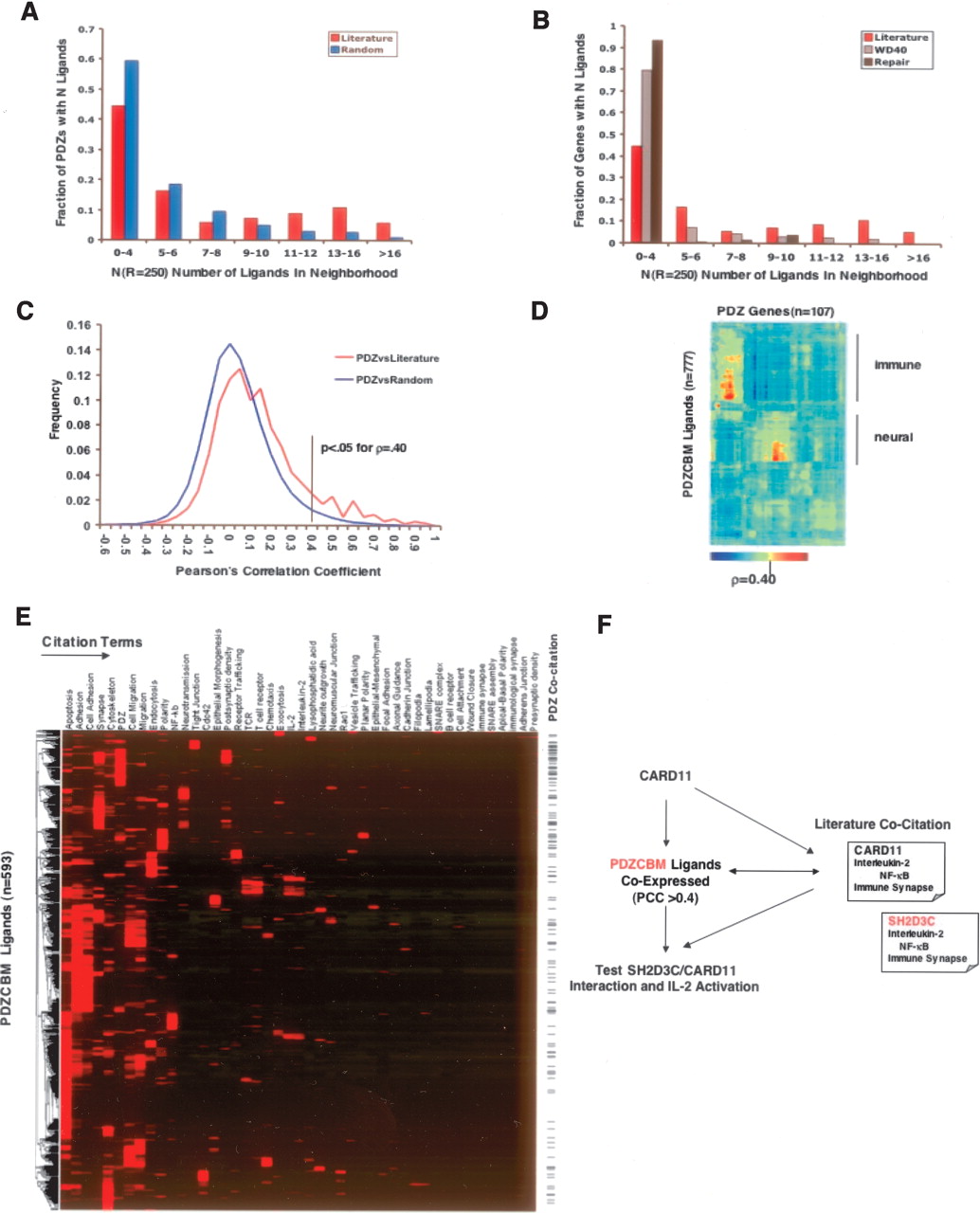 Co-expression and co-citation profiling. (A) The PDZ domain-containing proteins and literature confirmed PDZ’s ligand gene sets are co-regulated by nearest neighborhood analysis (Mootha et al. 2003). Briefly, the PDZ neighborhood index N(R = 250) is defined as the number of unique ligands previously reported in the literature to bind PDZ proteins that occur within the nearest 250 genes ranked by Euclidean distance to a PDZ gene. The distribution is plotted for random distribution of ligands and for the literature-curated list of ligands (n = 192). For comparison, a set of random ligands of equal size to the literature ligands was generated and the distribution was calculated 1000 times with the average value shown (P < 0.001; permutation testing). (B) No significant co-regulation between known PDZ ligands and a set of 230 WD40 domain-encoding genes or with a set of 120 DNA repair genes was detected by neighborhood analysis. (C) Determination of pairwise Pearson’s correlation (PCC) cutoff of ρ > 0.40 suggests a potential direct or indirect interaction between the protein products of the PDZ gene and PDZCBM ligand. Two distributions were examined consisting of the PCCs of the 270 binary PDZ–ligand interactions documented in the literature survey and another distribution comparing PDZ genes correlations with a random set of ligands. The random distribution was calculated by generating 1000 permutations of random ligands of the PDZCBM gene set size (n = 899). A significant pairwise correlation value for potential PDZ–ligand interaction was derived based on the fact that <5% of the random distribution had (ρ or PCC) > 0.40. (D) Hierarchical clustering of correlation values (ρ) between PDZ genes and PDZCBM (n = 107 × 777) showing modules of co-expression between PDZ and PDZCBM ligands in immune and neuronal tissues. (E) Five hundred and ninety-three genes of PDZCBM clustered by similarity of PubMed literature co-citation profiles with 43 terms describing location, functionality, and interacting proteins of known PDZ ligands and complexes. (Note: 306/899 did not have citations with any of these 43 terms.) The tick marks on the side indicate those PDZCBM genes that are co-cited with the term PDZ. (F) Flow of information used to identify CARD11–SH2D3C interaction combining PDZCBM comparative genomics with co-expression profiling and co-citation profiling.