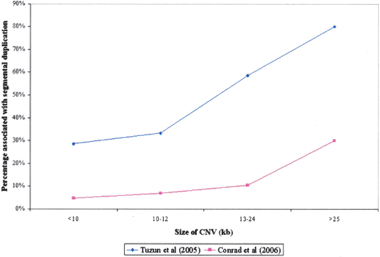 The positive correlation between size of CNVs and likelihood of association with segmental duplication. This correlation is noted by both the Conrad et al. (2006) and Tuzun et al. (2005) studies. The lower proportion of segmental duplication-associated CNVs in the Conrad et al. (2006) data relates to the greater difficulty in detecting CNVs in regions of segmental duplication when analyzing SNP genotyping data as opposed to fosmid end sequence mapping. The CNV size classes were chosen so as to obtain approximately equal numbers of CNVs in each class for the smaller data set.