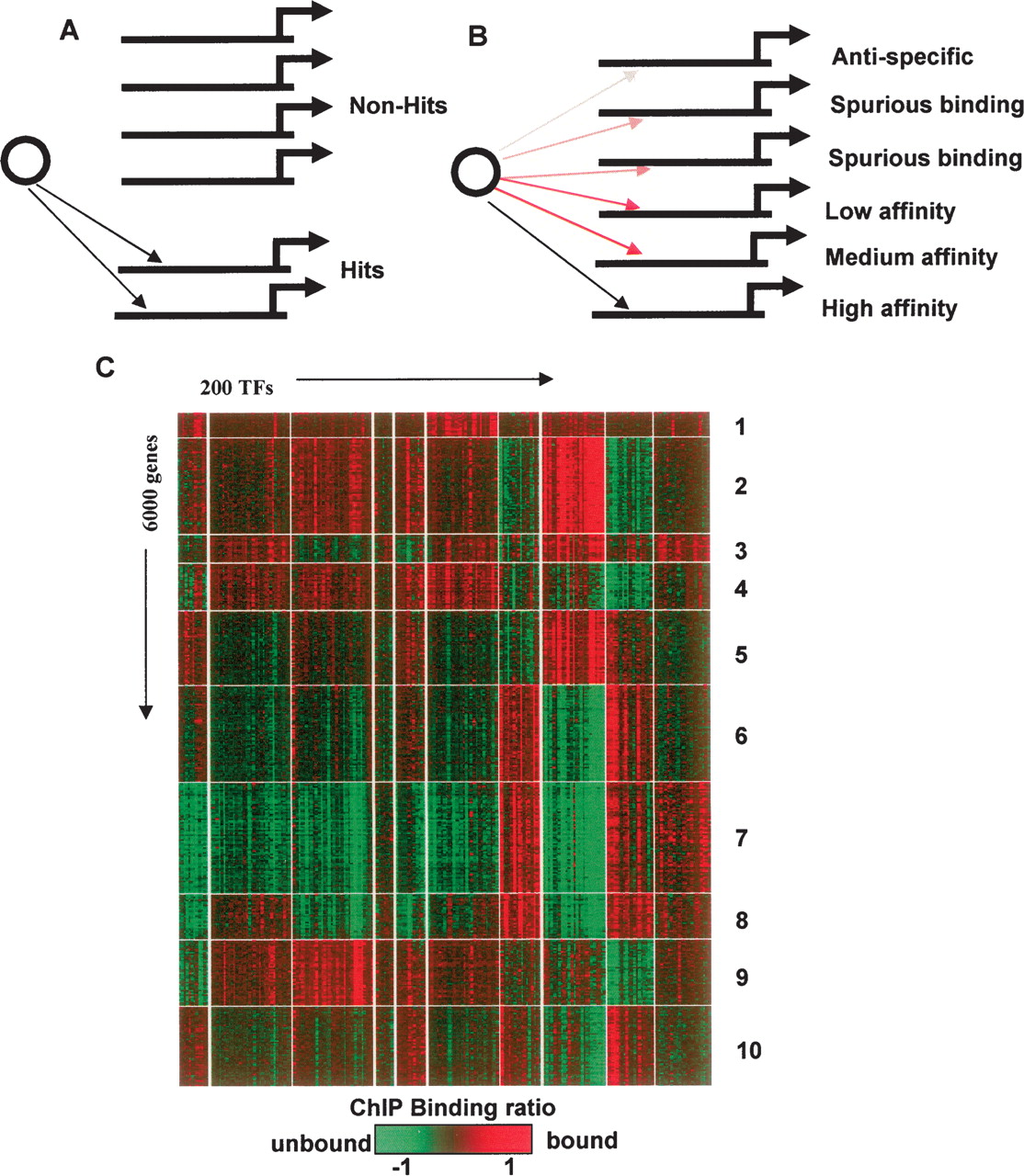 The transcriptional program in yeast: digital or analog? According to the prevalent “digital” hypothesis for transcriptional regulation (A), complex regulatory programs are described using wiring diagrams that associate TFs to genes deterministically. In the alternative “analog” model (B), many TFs may affect each gene at drastically different levels of specificity. Two-way clustering of 200 ChIP binding profiles and 6000 yeast genes (C) reveals groups of genes with remarkably similar binding ratios in all 200 ChIP experiments. Few of the entries in the homogeneous submatrices represent high-specificity TF–gene associations. The clusters and their association with biological functions (Supplemental Table 1) suggest that ChIP experiments may reflect complex and functionally meaningful organization of low-affinity TF–gene interactions.