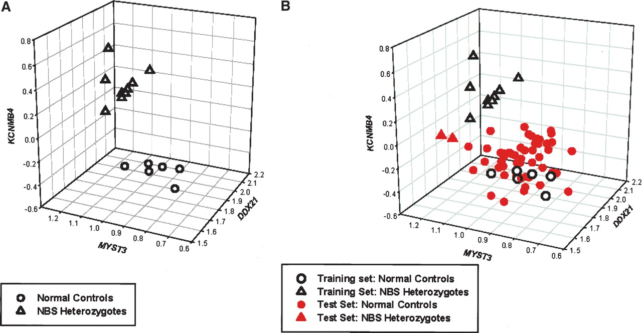 Expression level of three genes (DDX21, MYST3, KCNMB4) for (A) 16 normal controls and nine NBS carriers, and (B) same individuals as in A and 50 additional normal controls and two additional NBS carriers. Some data points overlap each other because some of the individuals have very similar expression levels of these genes.