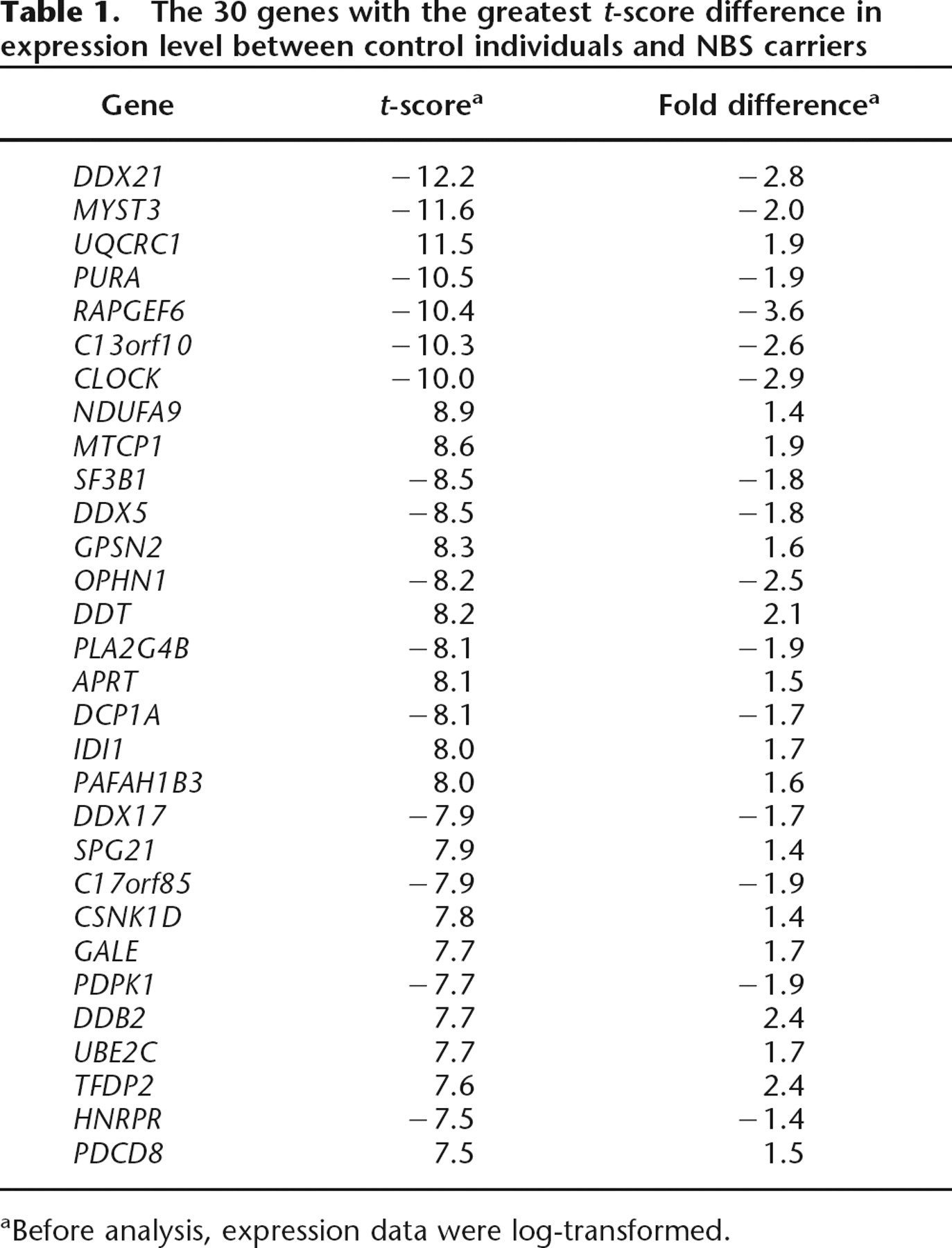 The 30 genes with the greatest t-score difference in expression level between control individuals and NBS carriers