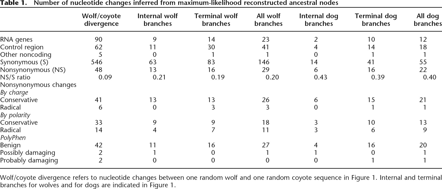 Wolf/coyote divergence refers to nucleotide changes between one random wolf and one random coyote sequence in Figure 1. Internal and terminal branches for wolves and for dogs are indicated in Figure 1.