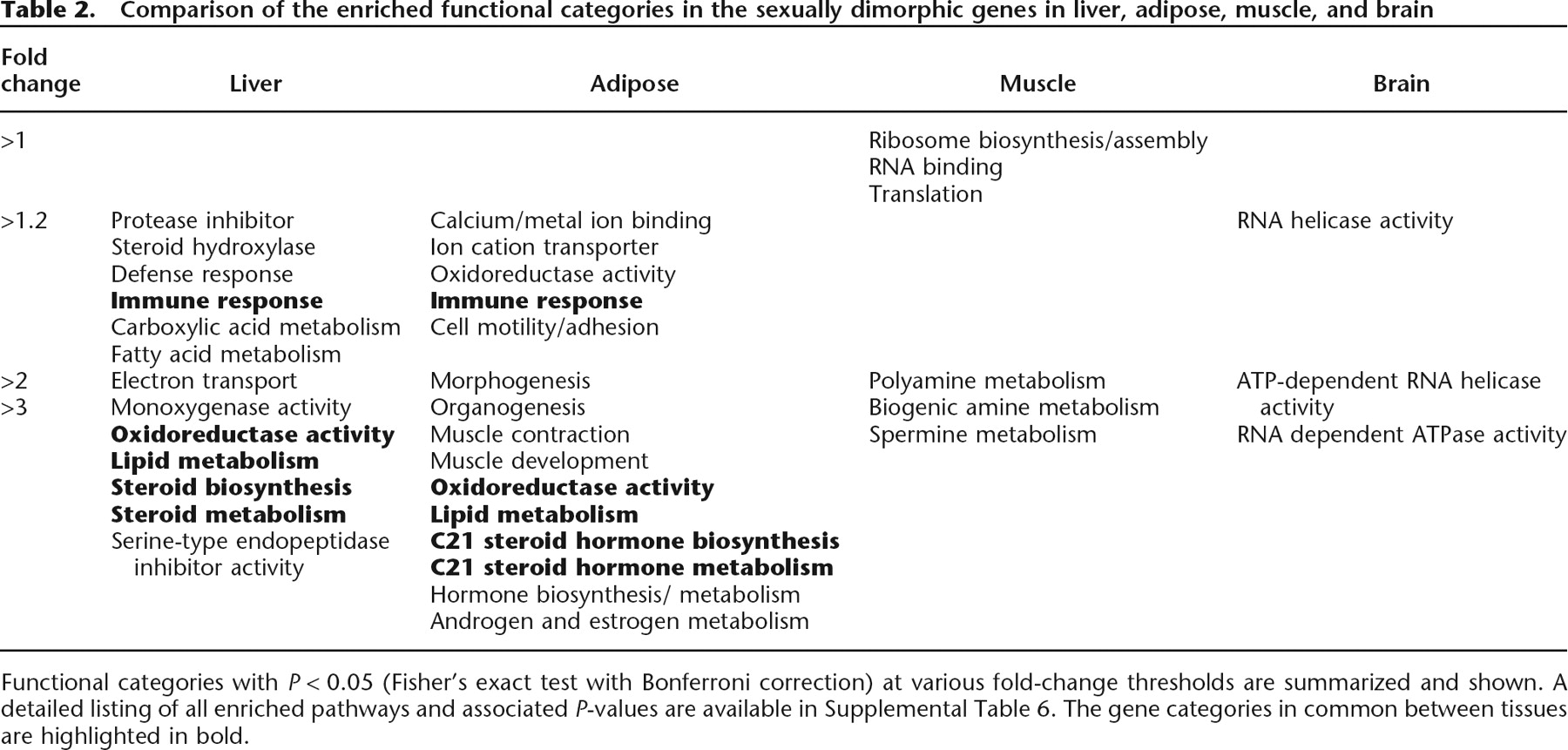 Functional categories with P < 0.05 (Fisher’s exact test with Bonferroni correction) at various fold-change thresholds are summarized and shown. A detailed listing of all enriched pathways and associated P-values are available in Supplemental Table 6. The gene categories in common between tissues are highlighted in bold.