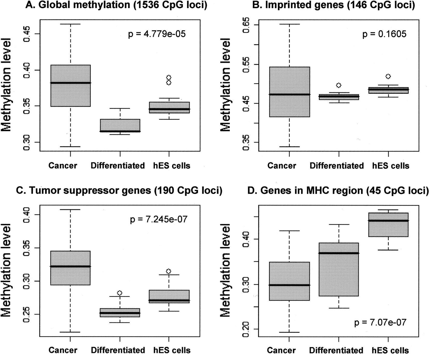 Boxplots of methylation levels in three sample groups—hES cells (N = 16), differentiated and somatic stem cells (N = 13), and cancer cell lines (N = 24). (A) Global methylation levels, calculated using all 1536 CpG sites; (B) methylation levels of 146 CpG sites in 33 imprinted genes; (C) methylation levels of 190 CpG sites in 45 tumor suppressor genes; (D) methylation levels of 45 CpG sites in 13 genes from the MHC region. The black bar represents the median methylation level for each cell type, calculated from the means of each individual cell line. The gray box defines quartiles (25% and 75%, respectively). The error bars are 1st and 99th percentiles of the distribution. Dots represent the outliers. P-values were computed using the Kruskal-Wallis test, which indicates the likelihood that all medians are the same.