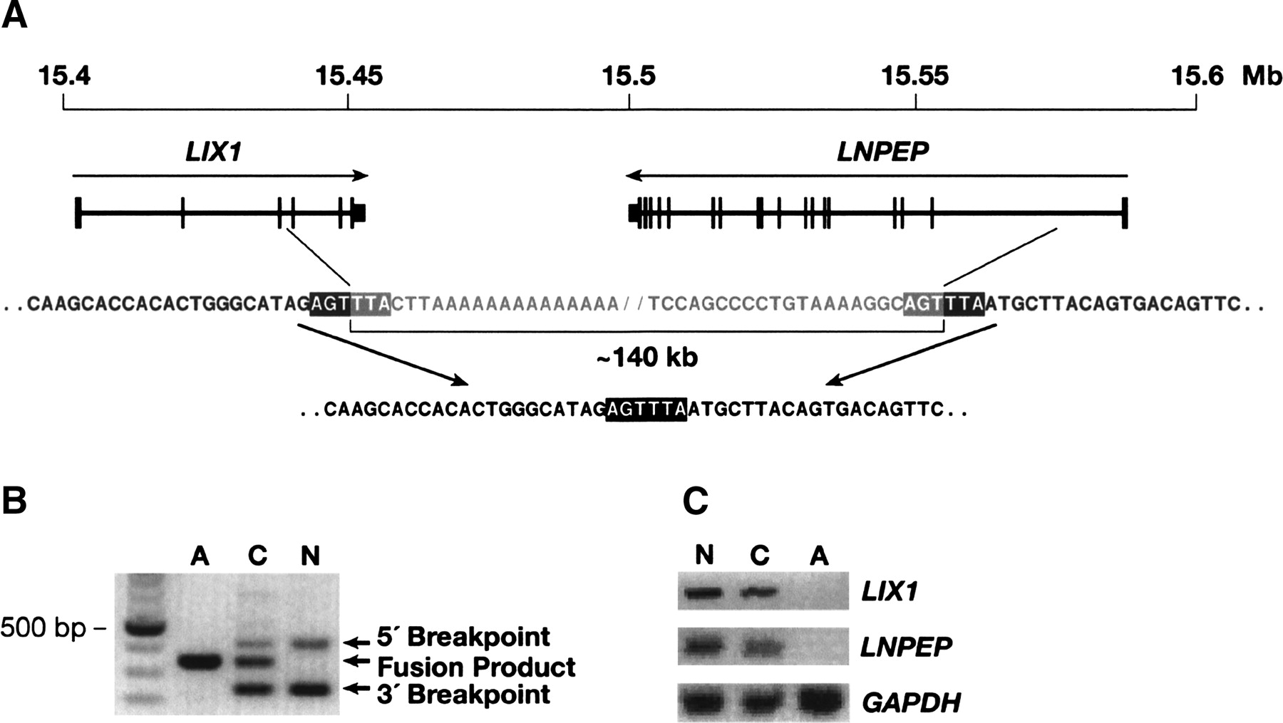 An ~140-kb deletion abrogates LIX1 and LNPEP expression in SMA affected cats. (A) A schematic of the genomic organization of LIX1 and LNPEP on FCA A1q. Arrows indicate the direction of transcription of each gene. The scale of chromosome coordinates is from the region of conserved synteny in the dog genome (CFA 3) (UCSC Genome Browser; July 2004 assembly). Sequence of the deleted and normal alleles are aligned showing the precise breakpoints below the schematic. The immediately flanking 6-bp sequence, AGTTTA, is in bold. (Note that the genome browser did not itself identify exon 1 of LNPEP by homology with RefSeq genes, but limited homology was identified by BLAT search of the dog genome with a cat sequence that was 82% identical over 300 bp of the human exon 1 and flanking 5′-UTR and intron 1 sequences). (B) PCR products produced from genomic DNA in a multiplex reaction designed to amplify across both deletion breakpoints when the normal allele (lane N) was present. A third product corresponding to the affected cat sequence shown in A amplified when the deleted allele was present, either in homozygous affected (lane A) or heterozygous carrier (lane C) cats. (C) RT–PCR products amplified from cervical spinal cord ventral horn RNA of a genetically normal cat (lane N), a clinically normal carrier (lane C), and an SMA affected cat (lane A). PCR primers for LIX1 were from exons 1 and 4, LNPEP primers were from exons 14 and 15, and GAPDH primers were from exons 6 and 8.