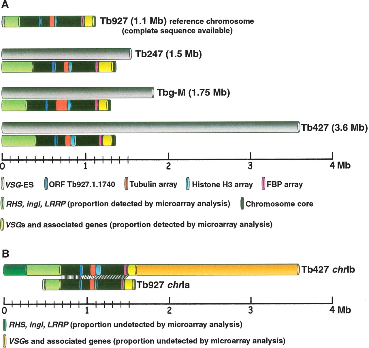 Models of chromosome expansion based on the comparative microarray analyses and sequencing of chromosome-specific DNA clones presented here. Note that we make the assumption that all gene families are positioned at the same location in both Tb927-chrIa and Tb427-chrIb, and therefore that arrays expand/contract in situ. (A) Comparison of chrI size as estimated by PFGE analysis of different isolates of T. brucei (gray bars) with the theoretical maximum length estimated from the microarray and Southern blot analyses comparing the test chromosomes with Tb927-chrIa. Colored regions correspond to tandemly repeated genes and gene families that show a significant degree of polymorphism compared with Tb927. (B) Our proposed model of Tb427-chrIb organization. The central core is highly conserved compared with the sequenced Tb927-chrIa; sequences in the left subtelomeric region are amplified about twofold, but there is no VSG-ES. Results presented here indicate that the remainder of the additional DNA in Tb427-chrIb consists primarily of VSG arrays and associated sequences. We propose that this forms a hemizygous “subtelomeric” region of ∼2 Mb, and that this is probably on the right end of the chromosome.